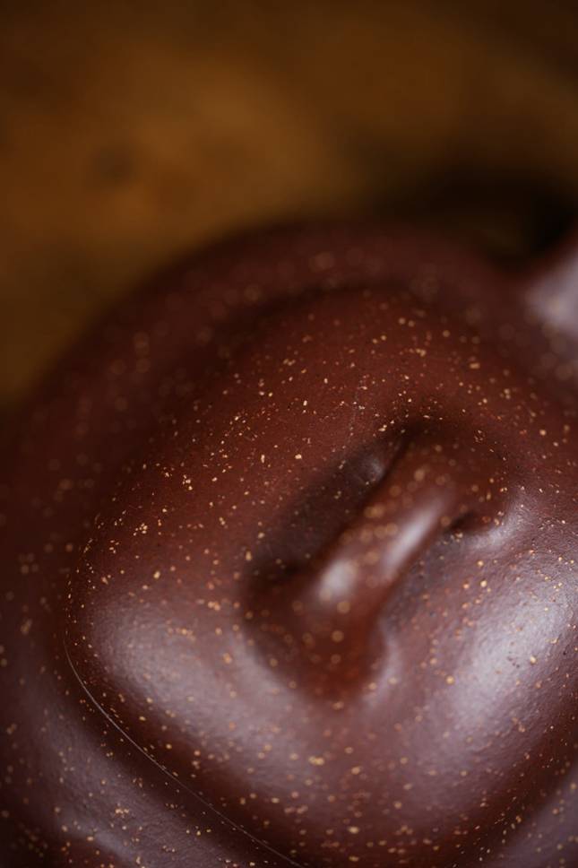 汤玮老师以「隐坨」为题,用一块醇厚的底槽清泥,铺洒细密金砂,塑就这尊190cc的紫砂小壶。其形取意“坨实”,壶身圆融饱满,宽腹敛足,线条如远山轮廓,沉稳内敛。盖与口严丝合缝,桥钮弧度贴合指尖,处处显露“器以载手”的古老智慧与实用匠心。