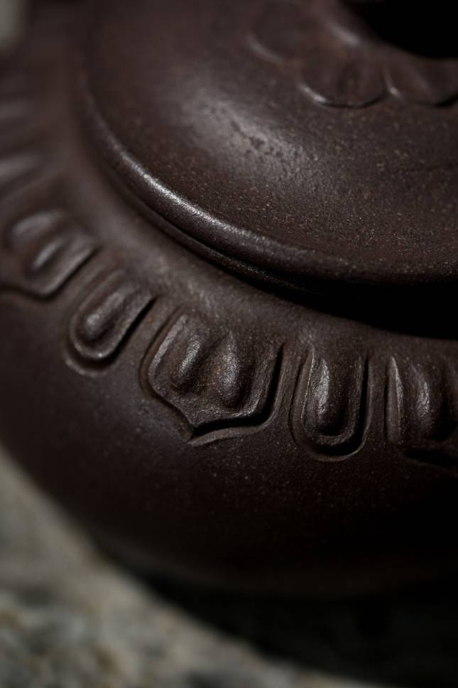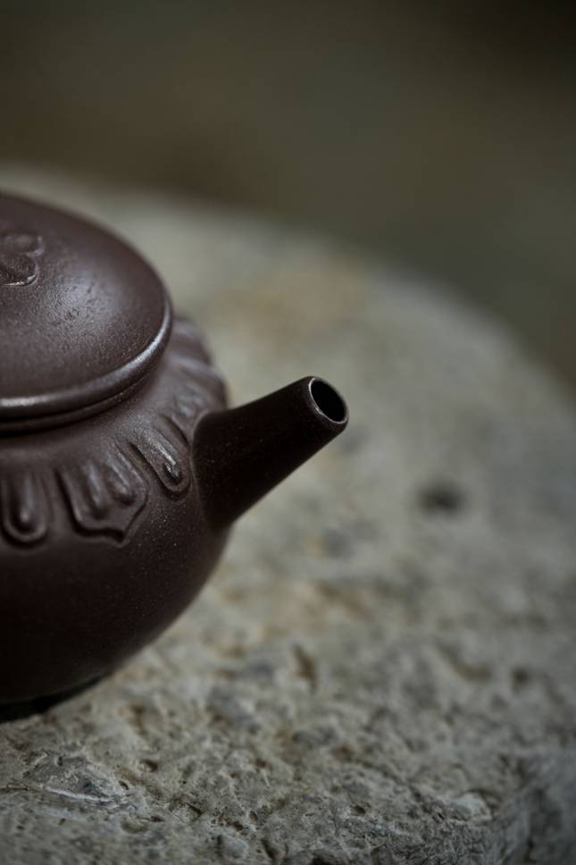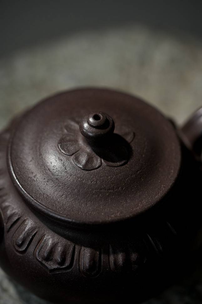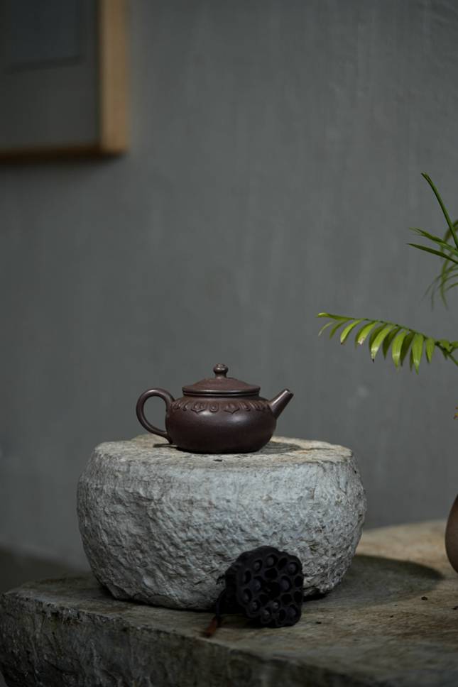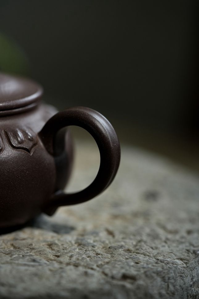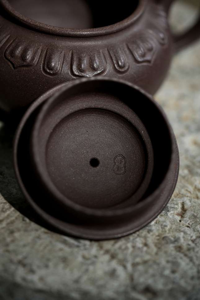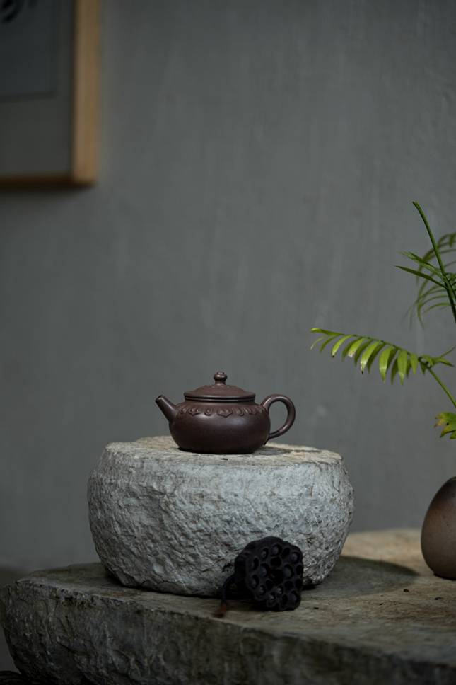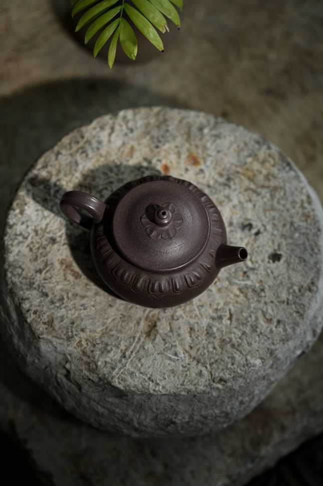壶身取紫泥为料,泥质细密,光下泛着哑光的砂粒质感。150cc的容量,握在手中是不张扬却压手的温润分量,仿佛托着一方静谧的小天地。壶肩处,一圈莲花浅浮雕静静绽放,线条软润如晨露栖瓣,似有若无;盖钮则承托一朵敛瓣莲苞,巧思藏于细节——气孔隐于苞心,出水匀缓而静默,恰似其名,如梵音轻落,不疾不厉。