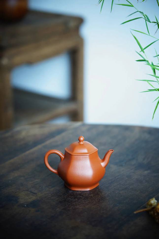当代宜兴陶人对器形的选择与把控素有一套传统结构法则,朱泥器体系尤为鲜明。一方面是陶人的求变拓新,另一方面来自消费市场的需求,较之古壶,朱泥器的造型、比例也有了新的方向。此拍品由当红紫泥菁英邹成程先生将“潘壶”体,化圆为方,选用上等原矿朱泥制作而成,简洁明快、灵动秀气的表现欲强烈,但又不失古壶的韵美。