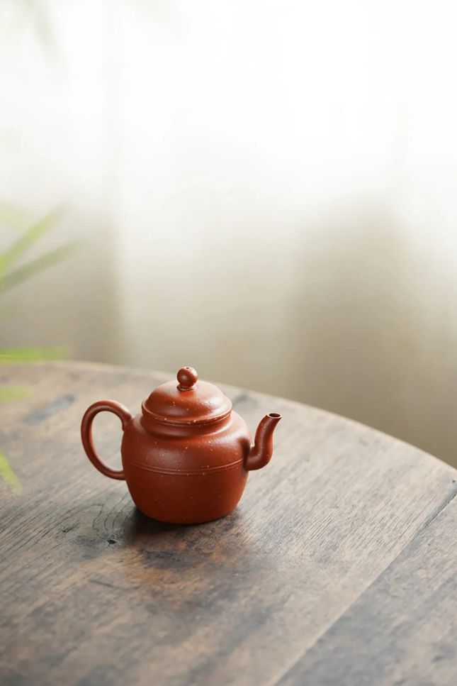 用卿古式,调砂朱泥为胎,穹盖珠钮,束腰,体做宫灯式。造型端庄典雅,圆肩直颈,弯流与圈把搭配的相得益彰。