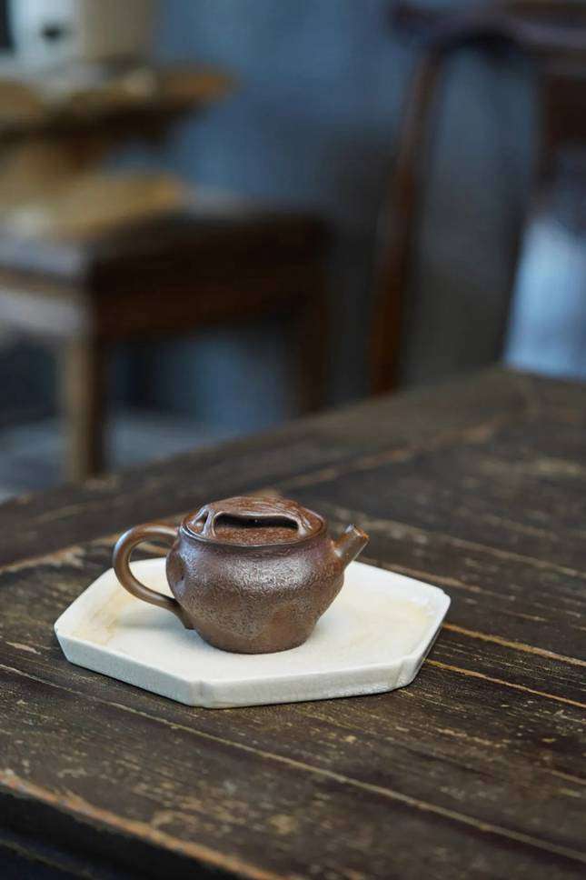 选用紫泥徒手捏制,放松自然,展现紫砂良好的可塑性。柴烧而成,则追求火与陶的完美结合。壶似树段似土石,枯树皮当提纽。作品取名《空寂》,佛家说:万物了无自性,无生无灭,是空寂。中国哲学说唯道集虚,体用不二是中国人的生命情调与艺术意境的实相。可于空寂处见流行,于流行处见空寂。这也正是通过作品所要表达的意思。