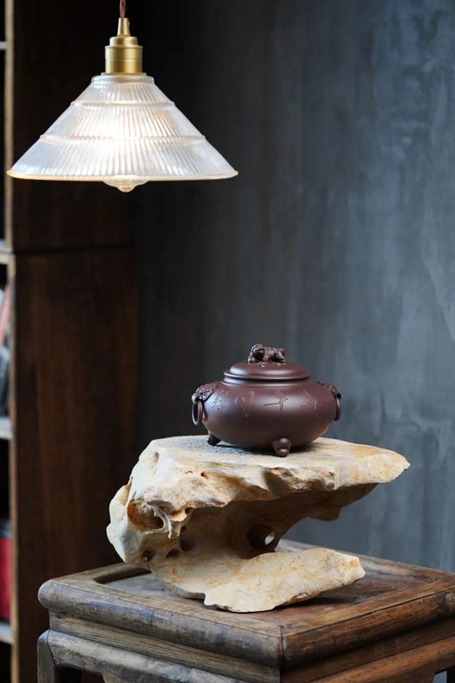 《云海江南》醒茶罐采用瑞兽钮来装饰,狮子踩绣球,象征好运连连,驱邪镇宅的意义。壶身两边以虎兽面,威武庄严,神态坚定,寓意镇守和权利的象征。醒茶罐在实用性的前提下,呈现出的艺术效果给人以强烈的心灵震撼,生动地表达出紫砂器物的特有魅力,又不失紫砂特有的光泽质感。
