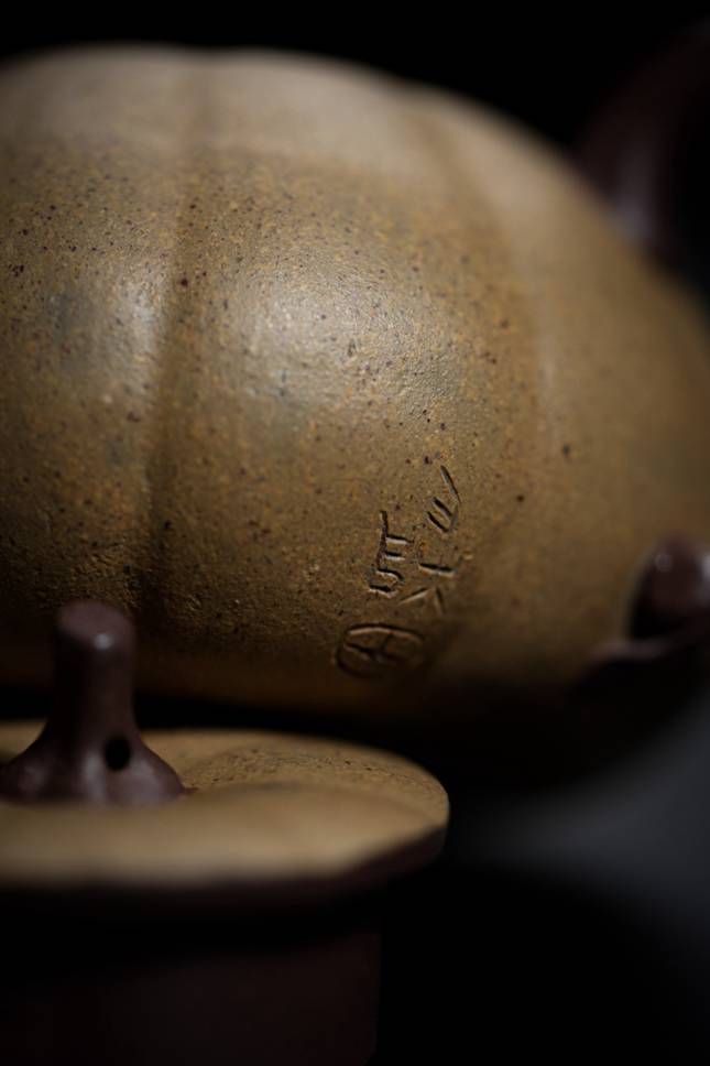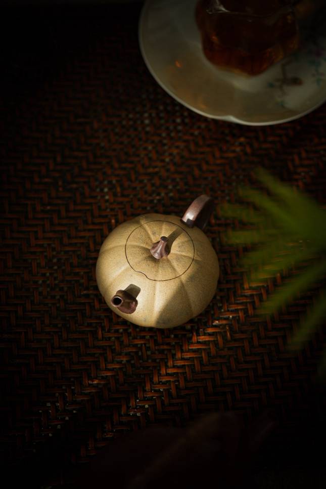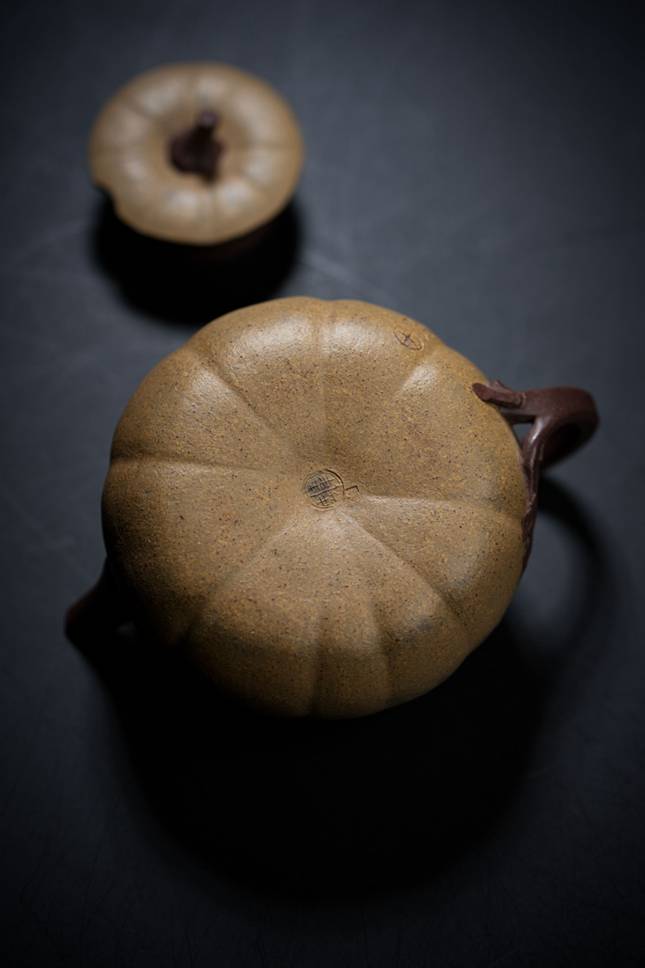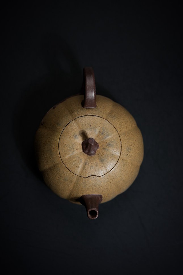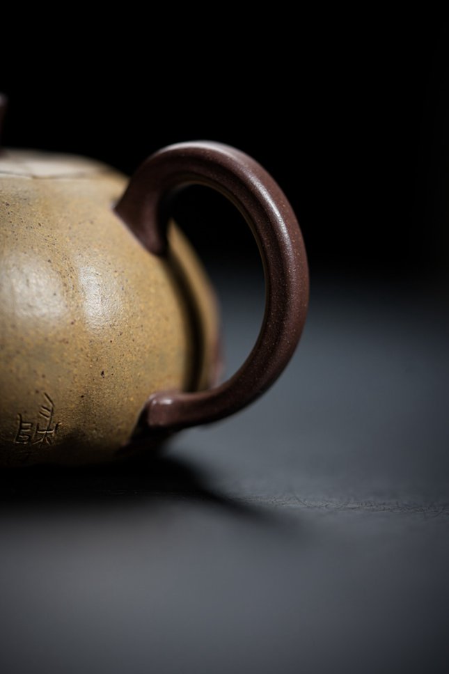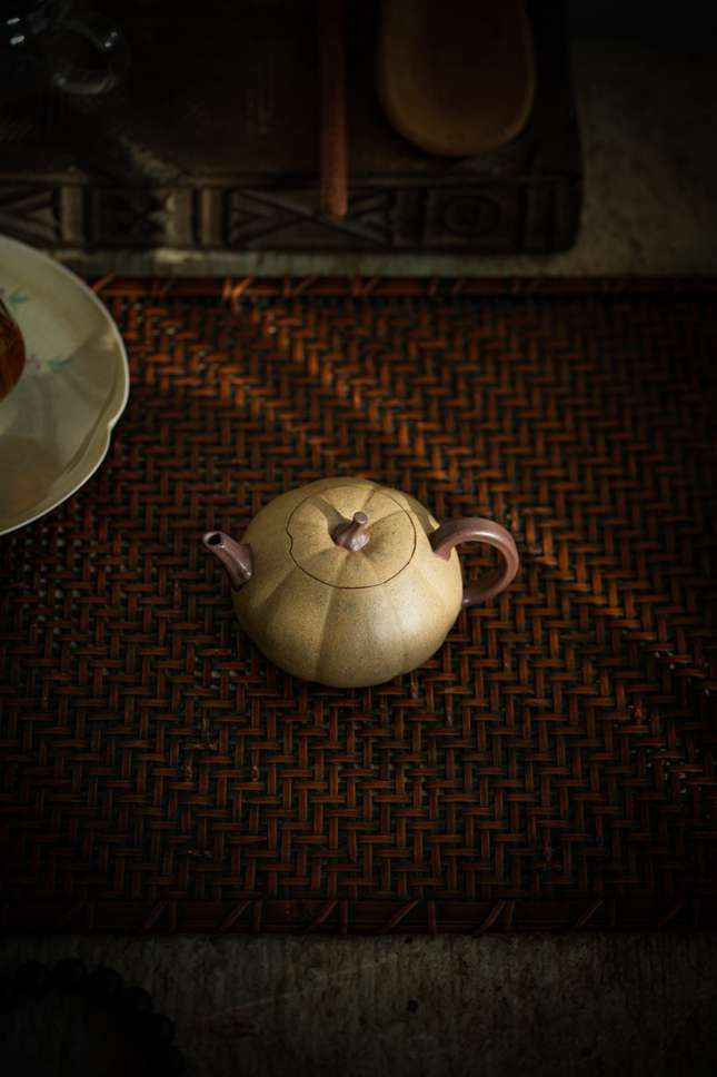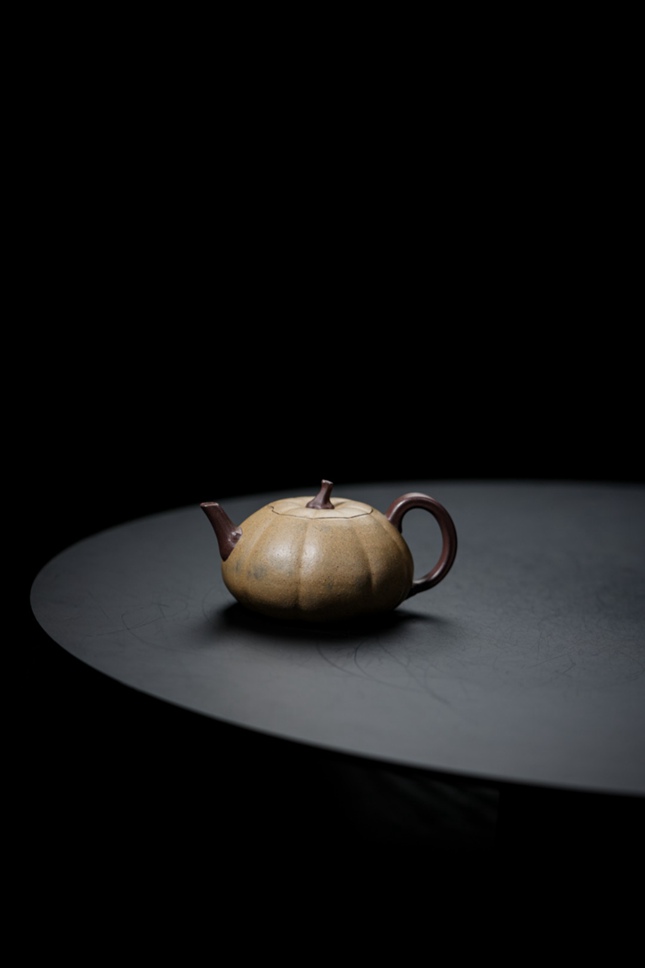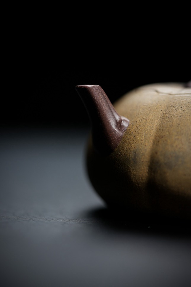 细观其艺,可见古法匠心。壶身瓣纹棱线,皆由泥条盘筑时以指尖一一掐出,起伏褶皱间蓄满手作的温度与呼吸。仿若秋藤的壶流与蜷曲瓜蔓的壶把,均以细腻捏塑呈现自然野趣;瓜蒂为钮,灵动鲜活。盖口衔接处历经手工反复修整,严丝合扣,轻叩有声,足见工之精微。