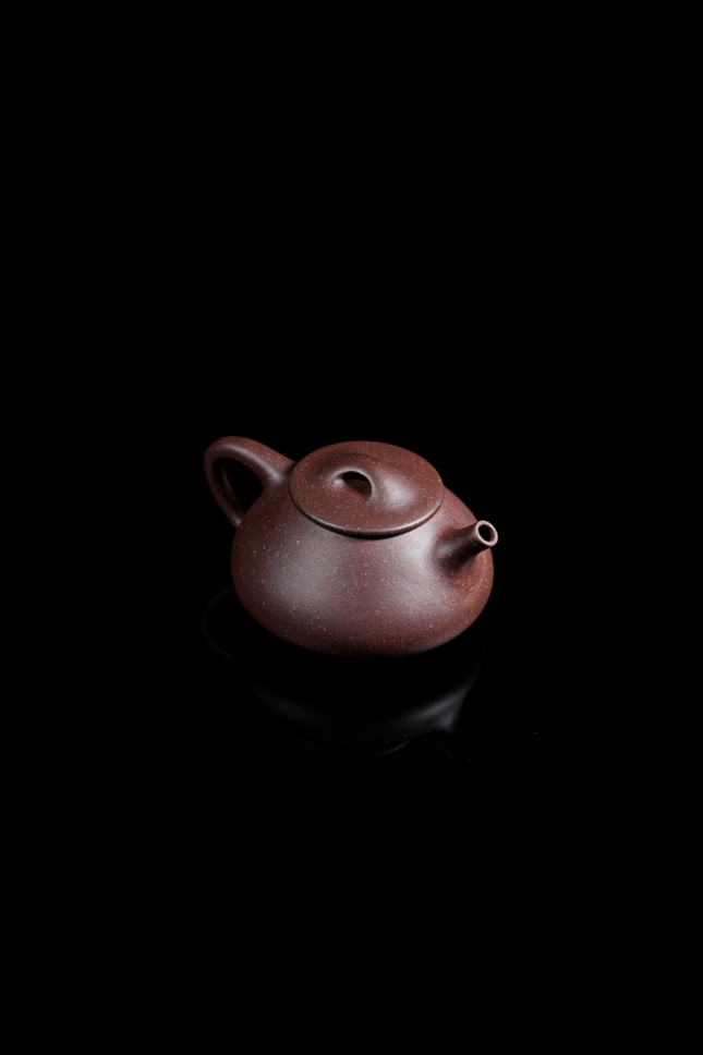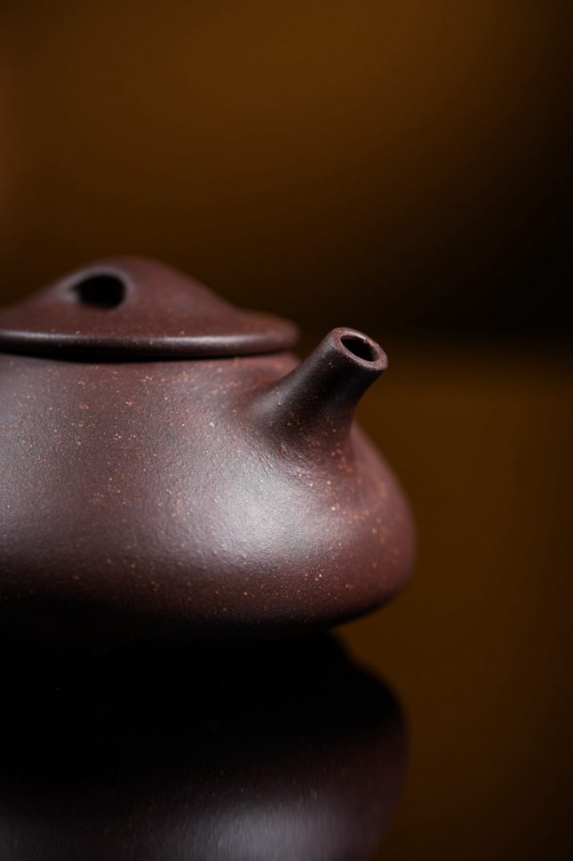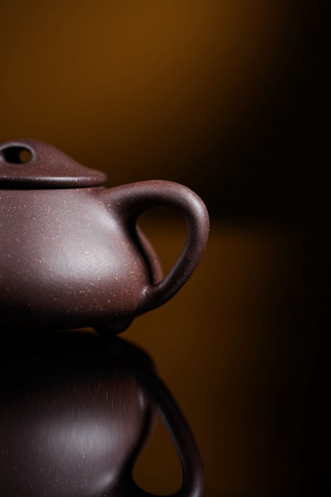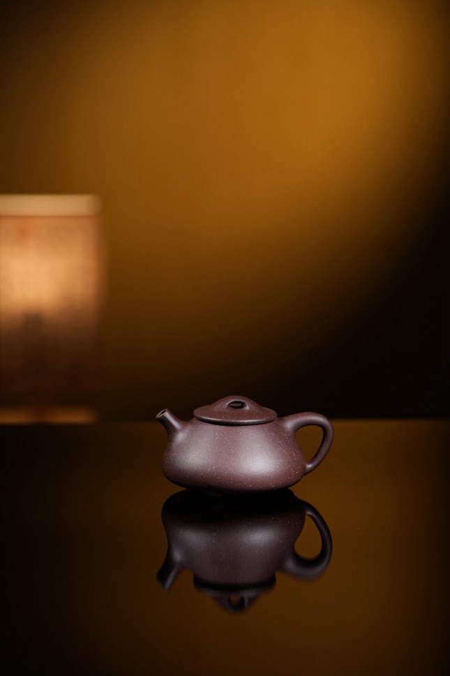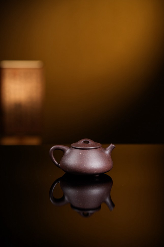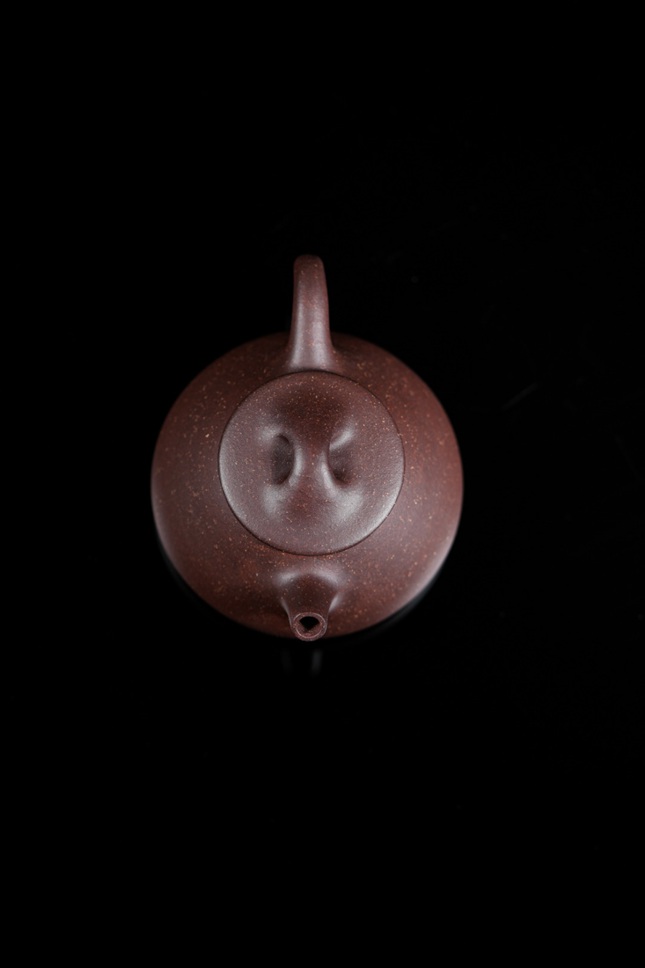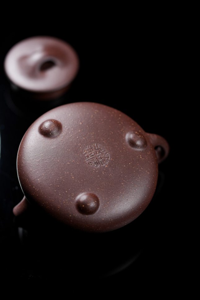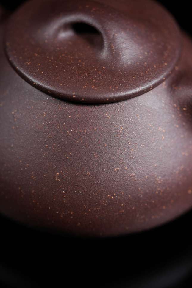 壶身选用优质原矿紫泥,泥料纯正,胎骨匀净。细观泥胎,密布的金砂颗粒宛若繁星,经高温淬炼后质地坚致,透气性佳,泛着温润内敛的柔光。日常茶事滋养,可逐渐养成古玉凝脂般的醇厚包浆,愈显珍贵。盖口吻合紧密,转动自如且气密性佳,盖内款识工整清晰,皆是匠心与技艺的可靠见证。