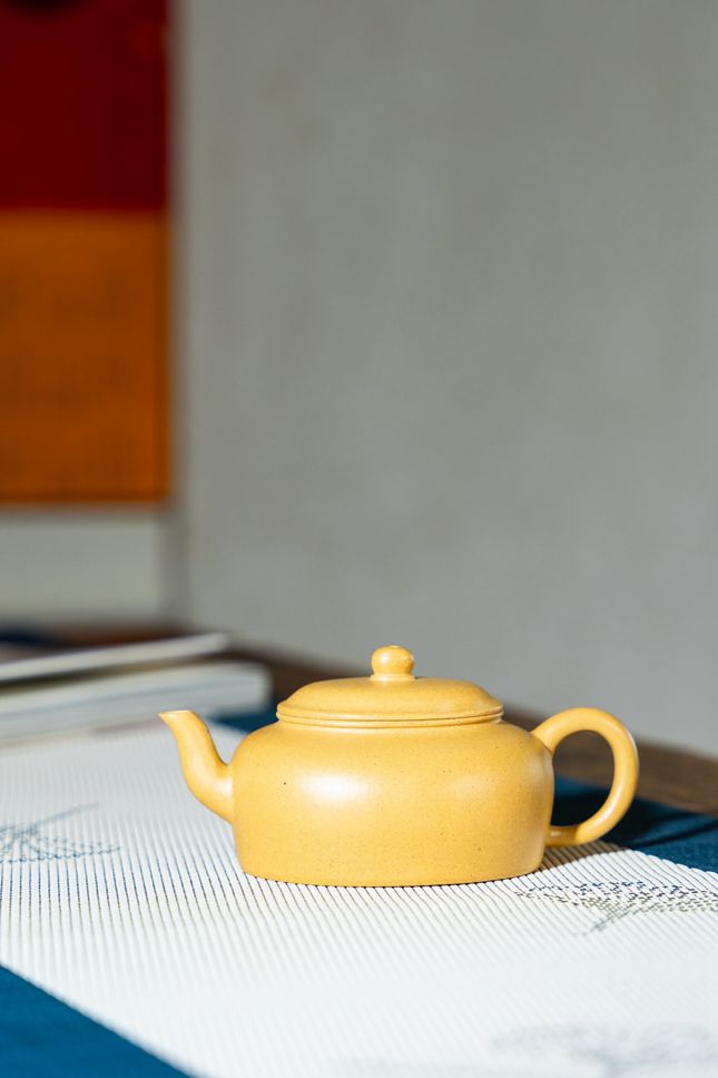 《金轮》紫砂壶以原矿本山绿泥制成,泥色金黄温润,造型圆转如轮。作品由惠老师手工打造,线条流畅和谐,寓意圆满平衡,融工艺与哲思于一体,广受海内外藏家珍爱。