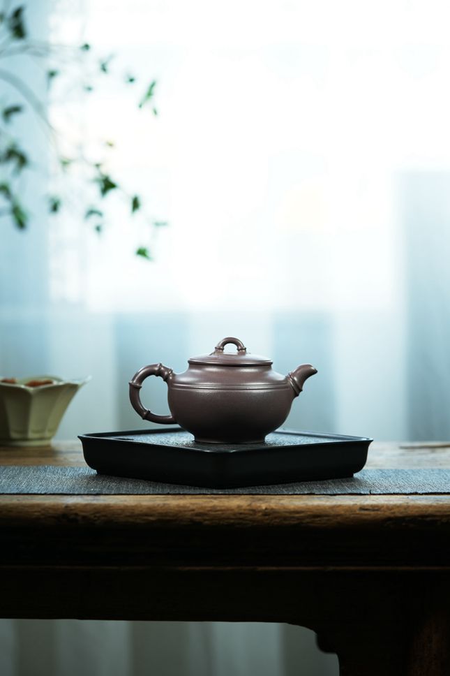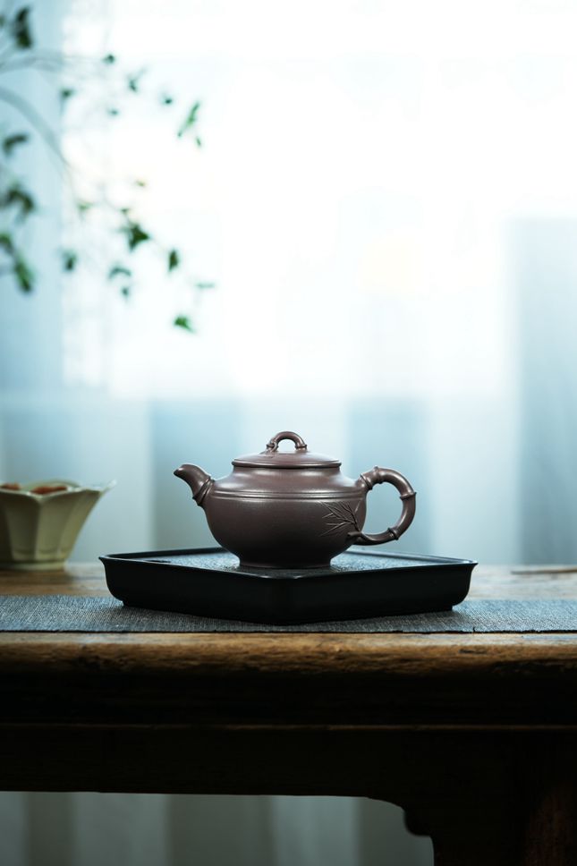 壶身以天青泥为料,泥色温润古雅,430cc的容量更添几分敦实气韵。壶流、壶把皆塑作竹节形态,流嘴三节胥出,挺拔有力;耳形端把四节勾勒,曲度从容。壶盖微鼓,壶钮化为竹枝弧形,与盖面浅胥的竹叶贴花相映,清疏有致,意趣盎然。