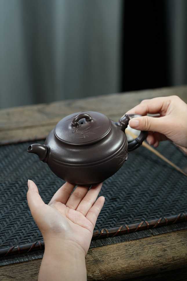 尤为精妙之处在于壶腹过渡处的双线装饰,如腰带横亘,令造型层次顿生。盖沿厚于口沿,压盖之势稳健饱满;加底设计与壶口同宽,构筑视觉平衡。整器光素为主,仅以竹叶点睛,毫无矫饰,却尽显竹之虚心与韧节。