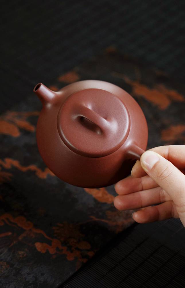 壶嘴作直流设计,线条劲挺而含蓄,以暗接工艺完美融于壶体,简洁中暗蕴力道。壶把弧度饱满柔和,与壶身造型虚实呼应,形成和谐均衡的视觉韵律。除去传统三足,壶底作沉稳布局,令整器安若磐石,稳重大器之风顿生。
