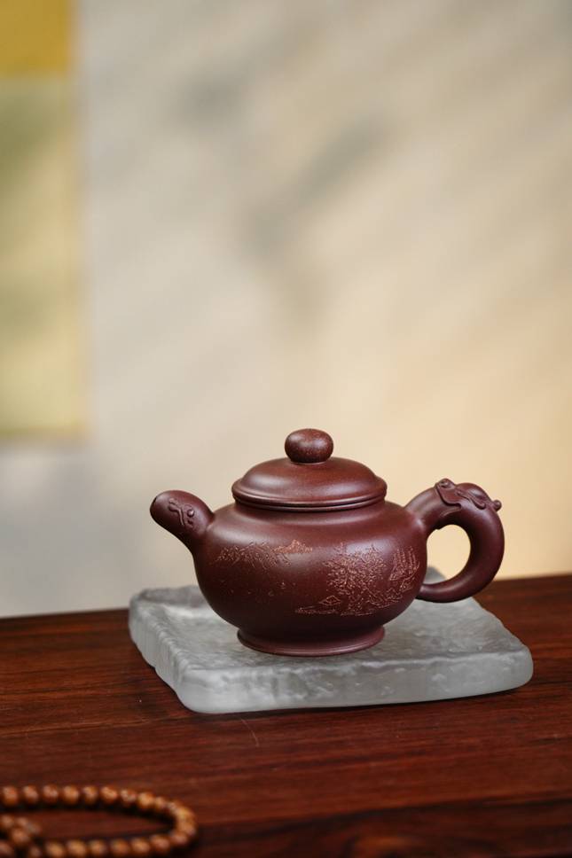 壶身一侧,以刀代笔,刻绘出一幅自然山水画卷:山石层叠嶙峋,松柏苍翠挺秀,意境幽远开阔,为整器注入盎然生趣与文人雅韵。壶把别出心裁,塑以祥龙造型,蜿蜒生动,既寓意吉祥,又于沉稳器型中增添灵动气韵。