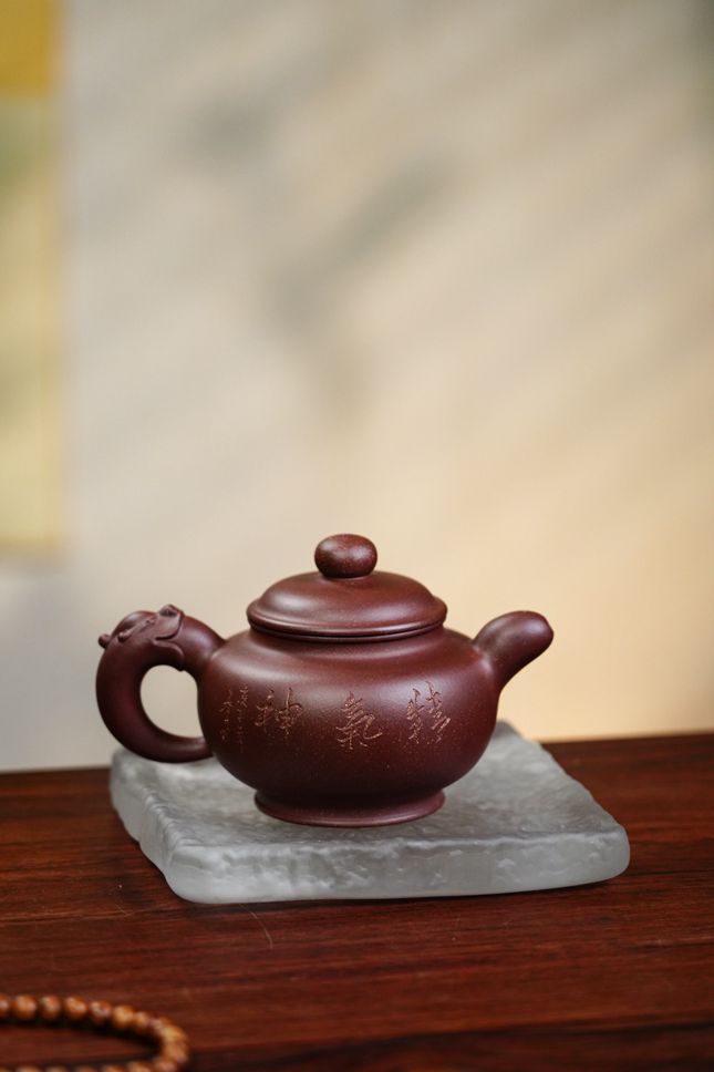 【龙韵掇只】壶,以原矿优质紫泥精制而成,容量340cc,泥色红润醇和,触手温润如玉。此壶由国家级高级工艺美术师陈老师全手工打造,器型古雅敦朴,以传统掇只壶为基础,融汇圆器之精髓,呈饱满球腹、矮颈短流之态,展现浑圆丰盈之美。