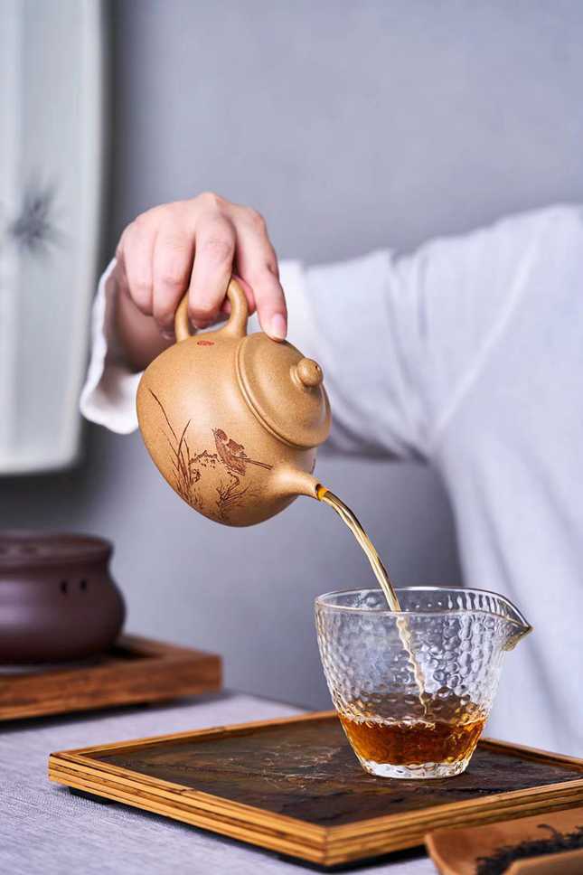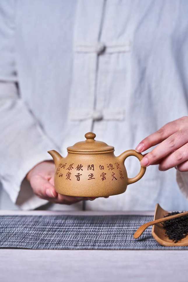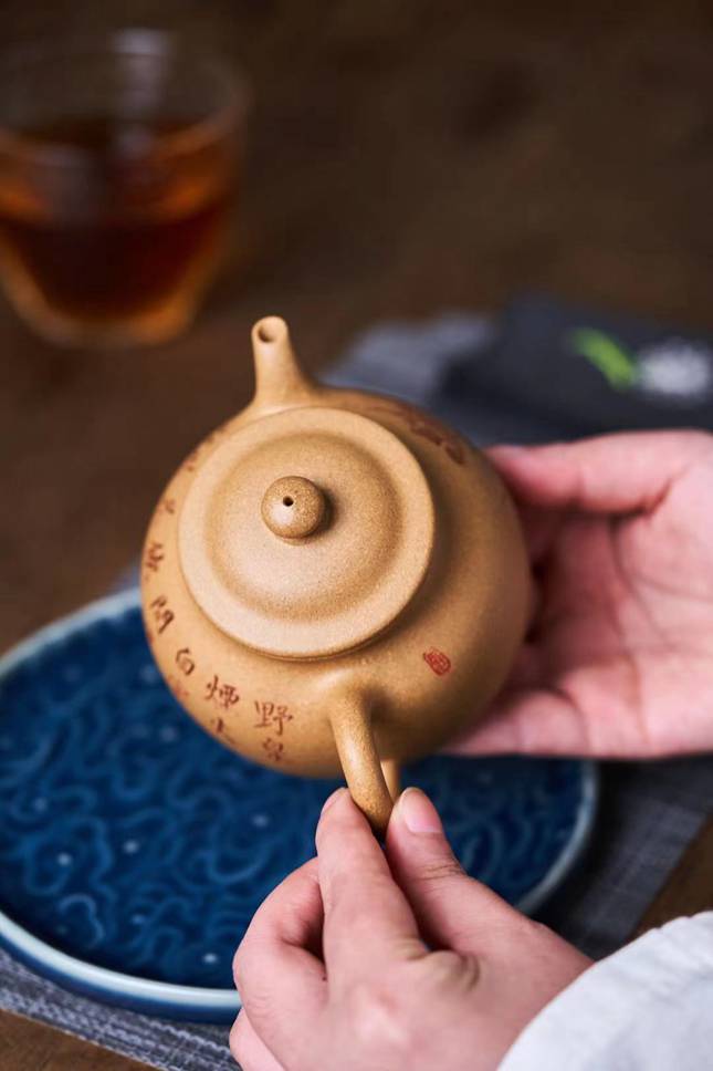 壶体胎骨选用原矿段泥,泥色如经霜秋谷,泛着温润内敛的光泽。国家级助理工艺美术师殷老师以刀代笔,在壶腹镌刻清雅画意,刻痕深浅有致,既添金石韵味,又与陶土肌理浑然一体,达到了“泥中有画,画蕴壶魂”的妙境。