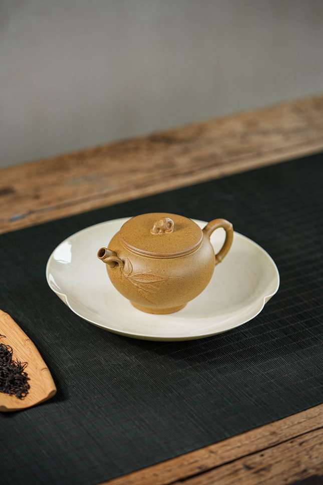 这把“竹韵”紫砂壶,以老练的手工技艺诠释了竹的气韵与风骨。壶体选用珍贵的龙骨金砂泥料,经窑火淬炼后呈现出古朴温润的老色,宛如历经岁月沉淀的竹干,静谧中自有力量。其150cc的容量,恰合一人独饮或二人对酌,在盈盈一握间,传递着手作的温度与匠心。