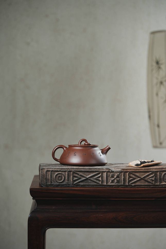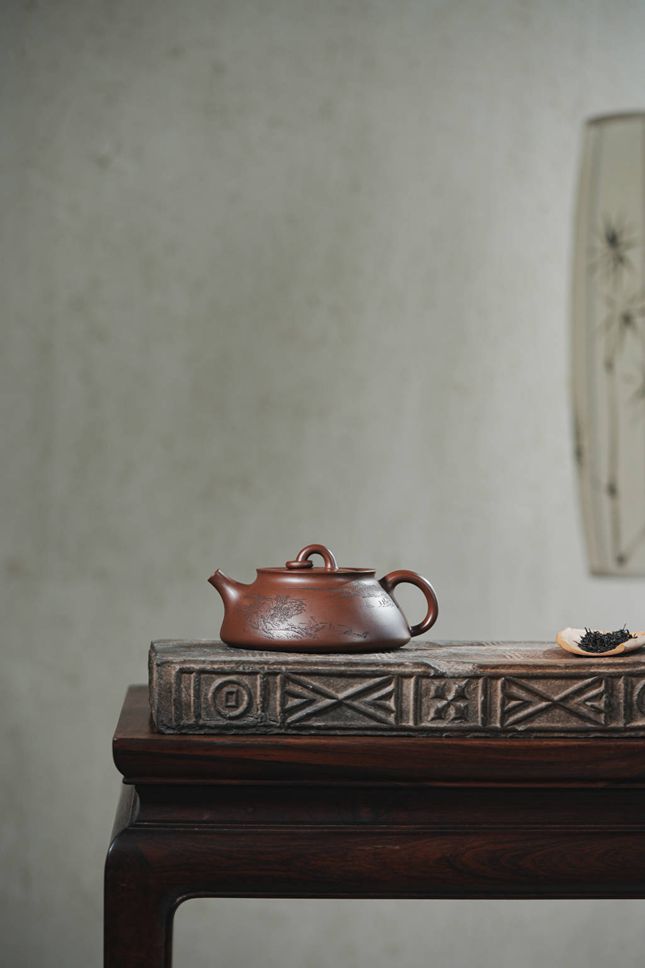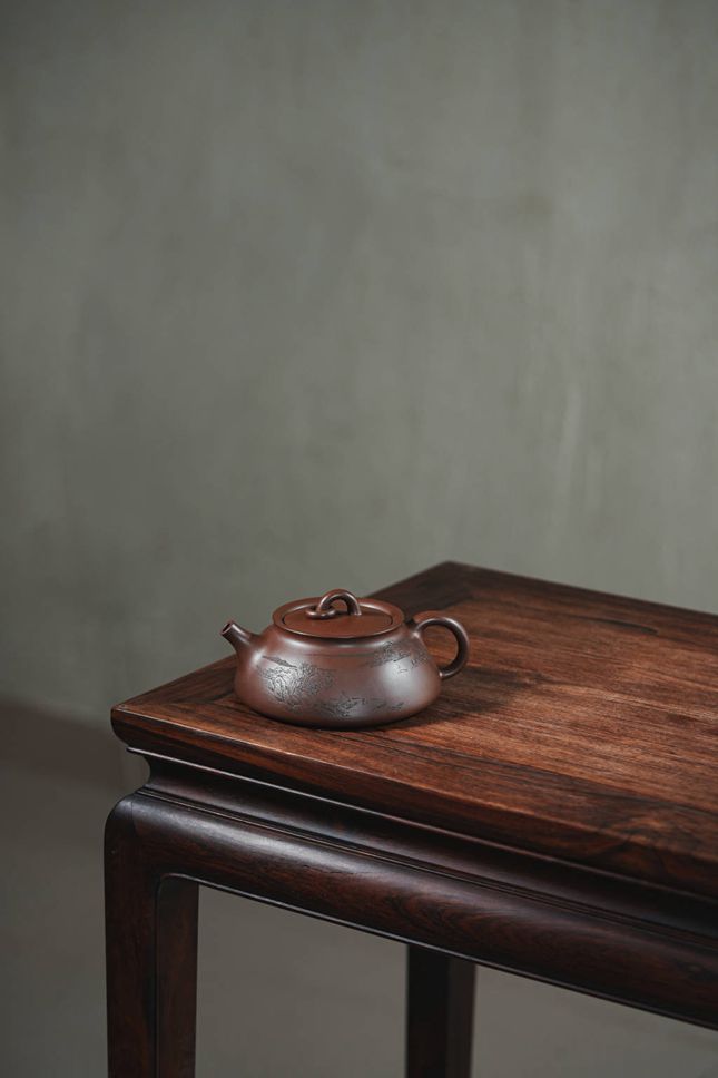 壶体之上,一幅远山近水的陶刻画卷徐徐展开,刀法流畅而意境幽远,为器物注入了文人诗意。与之相配的直流嘴,线条挺括,出水果断爽利,极大提升了冲泡时的实用性。此壶在360cc的合度体量中,完美平衡了稳重的气度与精巧的细节。