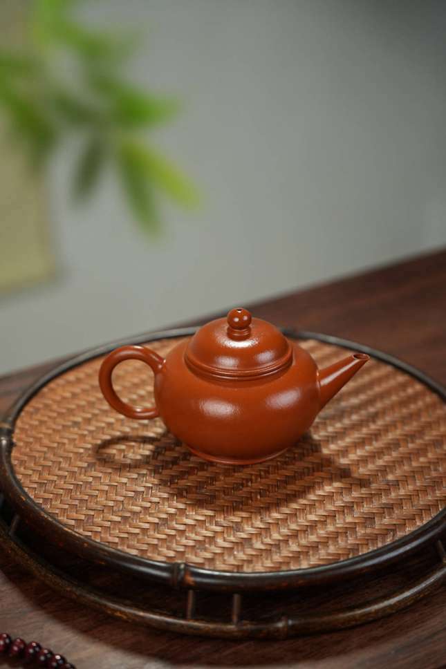 这款由惠老师所制的朱泥水平壶,容量为150cc,以经典的“水平”壶式为基,展现了朱泥特有的鲜明色泽与丰富层次。泥料质感细嫩绵密,触手温润,透气性佳,其暖融霞光与自然肌理,为壶体增添了生动的视觉韵律。整体壶形张弛有度,胎体坚实略薄,却依旧挺拔端庄,流露出沉稳大气的格调。