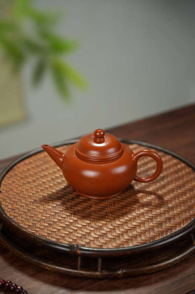 壶身设计饱满圆润,腹部丰盈凸出,向下渐次收敛,线条流畅而富有立体神韵。直流壶嘴昂然上扬,出水利落爽捷,自成一股昂扬气势;壶盖微微隆起,如帽圆融,与圆珠形壶钮相呼应,和谐中透出精工巧思。底部加饰圈足,更使整器稳健挺拔,静置案头亦显千军待发、风雨欲来之势。