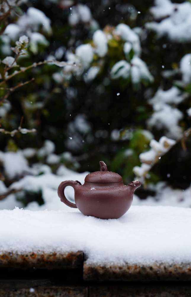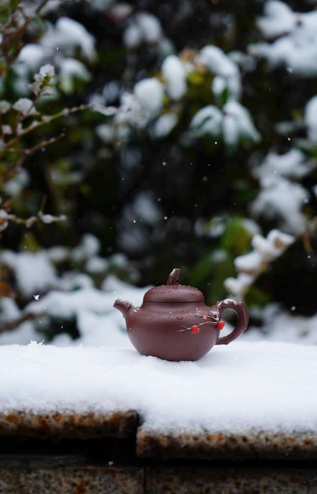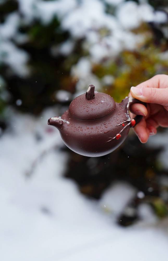整壶造型以“踏雪寻梅”为题,线条流畅婉转,壶钮、壶把与壶嘴的衔接处处可见匠心。壶身似雪覆大地,饱满圆融;局部塑以梅枝为饰,蜿蜒而生,宛若寒冬中悄然绽放的生机。工艺上采用精雕细镂的手法,梅枝细节处理逼真生动,既有雕塑般的立体感,又不失紫砂陶特有的古朴韵味。