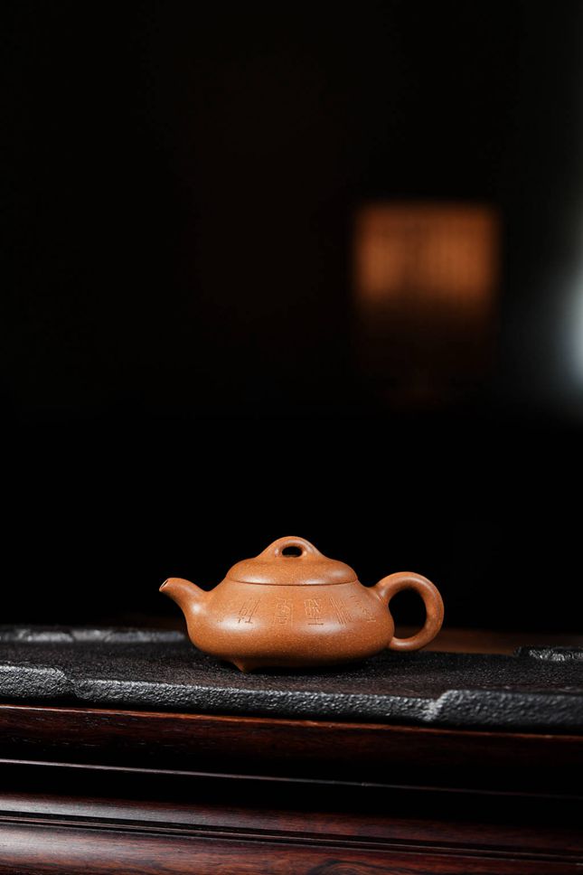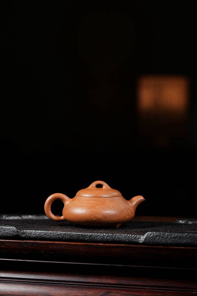尹老师的这款“汉棠石瓢”,以珍稀蟹黄段泥为胎,泥色温润如秋蟹初熟,辅以175cc的精巧容量,执握于掌心,尽显雅致之趣。壶身整体刚健挺拔,线条利落大方,既承袭了传统石瓢的稳重骨架,又在细节处流露现代审美意趣,静置案头,如磐石沉稳,气度俨然。