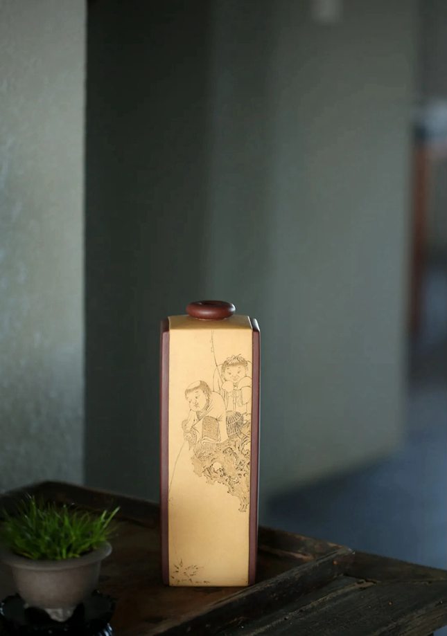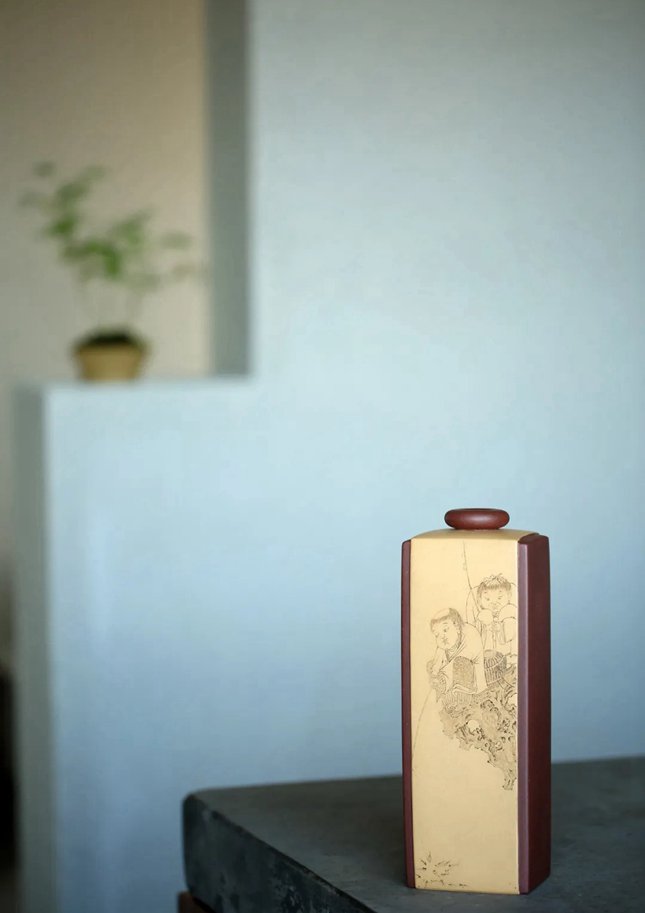 此拍品造型简约,醍醐灌顶。画面线条简单流畅,无凝滞感,刻刀似微风细雨,轻掠器身。刻绘蓬头稚子垂钓,线条细微,分毫不爽。没有绚丽的色彩,没有刻意的雕饰,在平淡浅易的叙述中透露出几分纯真,表达作者对于自然、雅趣的向往。