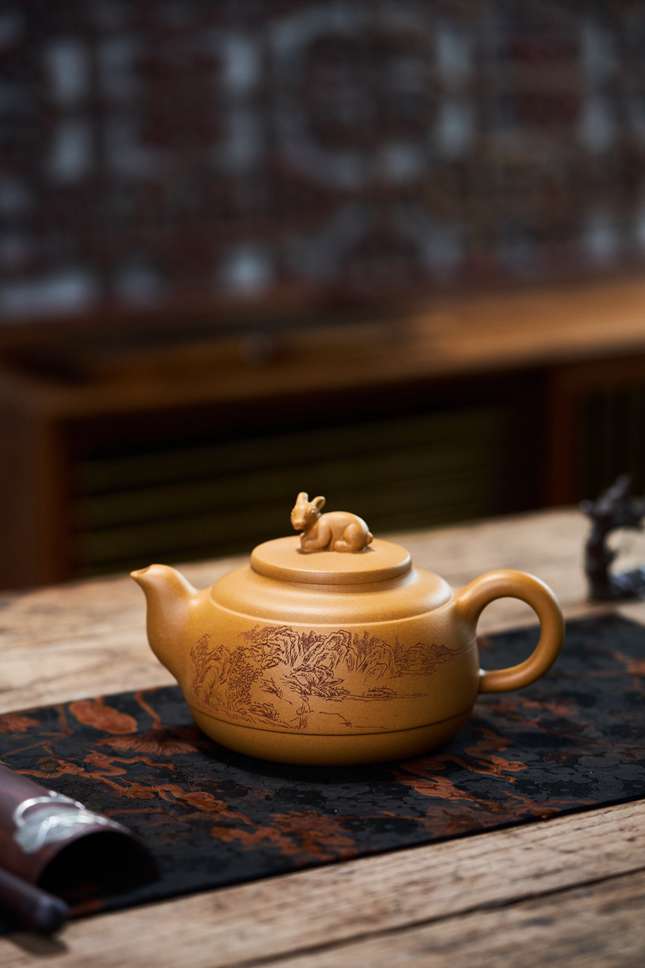 壶钮处匠心独运,以灵动的玉兔为型,伏于盖顶宛若守望祥瑞,为整壶注入生机与雅趣。一兔点睛,意境全出,既呼应传统祥瑞文化,又暗合月宫清雅之韵,寓意美好圆满。
