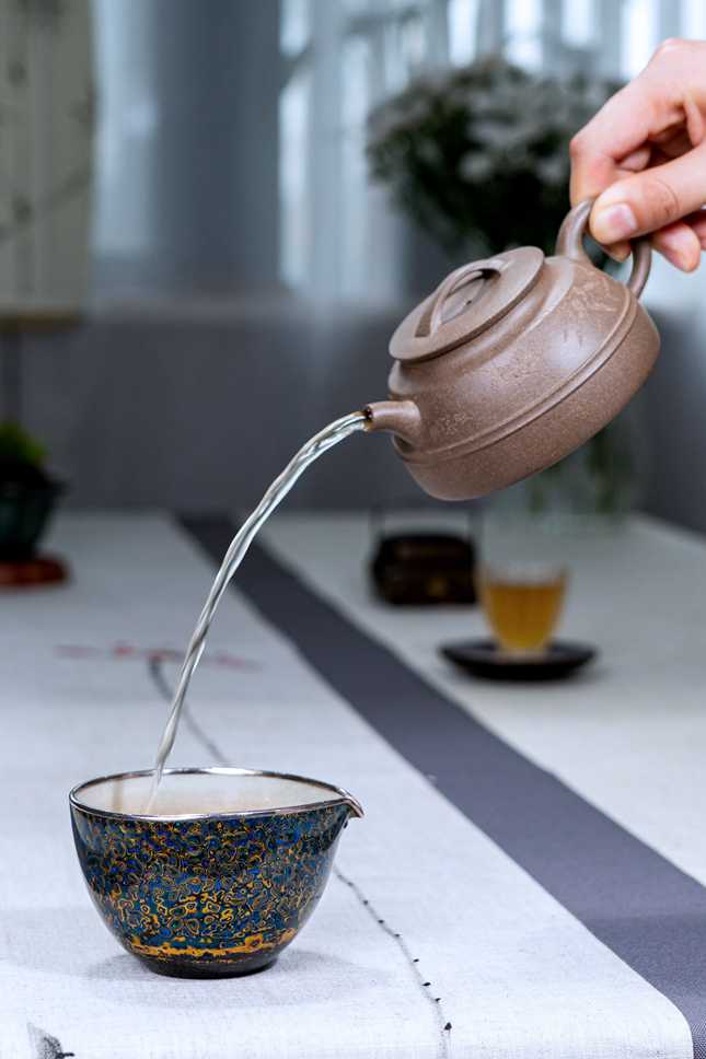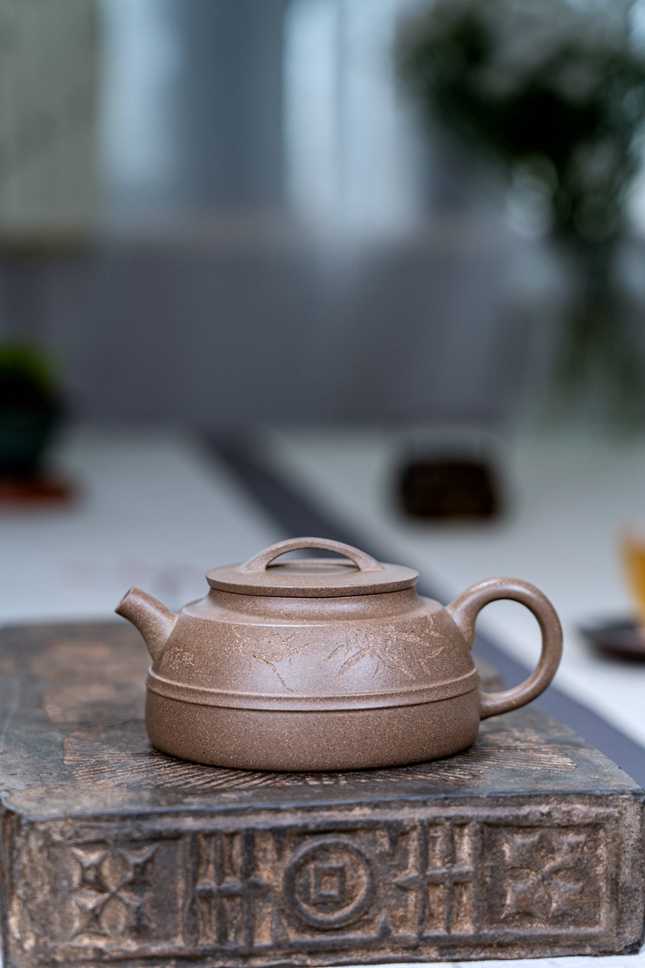 壶身造型层次丰富,结构严谨而富于韵律。盖部巧妙设计为桥梁平面,不仅工整匀称,更蕴含一片祥和安稳之意境。每一处转折、每一条棱线皆处理得细腻挺括,展现出制壶者深厚的工法功底与对器型气度的精准把握。