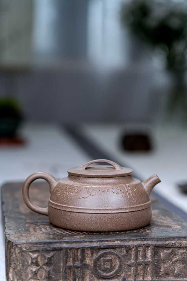 刻绘部分由研究员级高级工艺美术师何老师执刀,其刀法凝练传神,与壶体气质相得益彰,为作品注入人文意趣与艺术灵性。两位老师的倾力合作,恰如“一片冰心在玉壶”,将匠心纯粹与艺术追求,全然寄托于此壶之中。