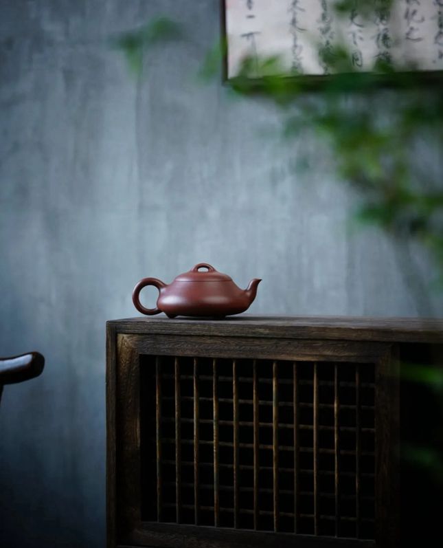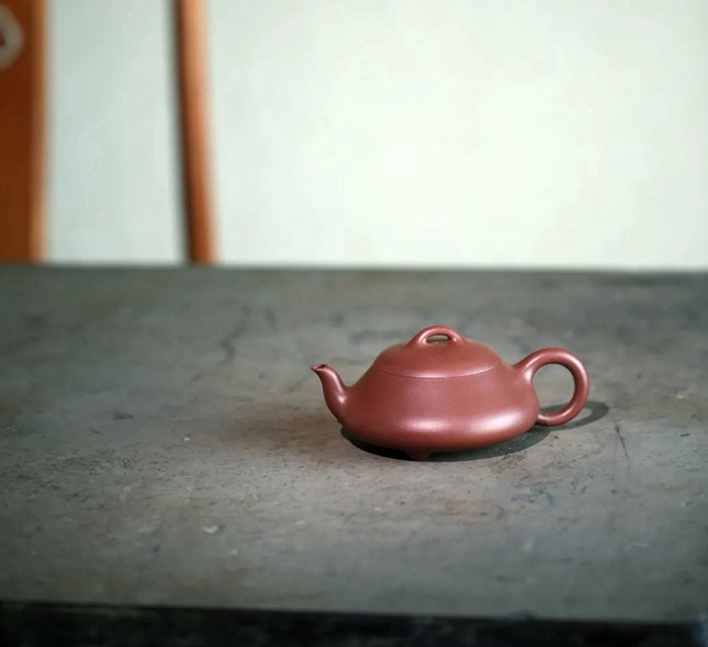 “石瓢壶”为砂壶款式中的一件经典之作。先有清中文人瞿子冶与同时代制壶高手杨彭年、申锡及吉安共创“子冶石瓢壶”,成为石瓢壶的开山鼻祖;后有“紫砂泰斗”顾景舟先生一生中四次创作“石瓢壶”;而徐汉棠大师所制“石瓢壶”也为大家所认可,成为其毕生砂壶创作的代表作之一。“矮石瓢”是徐汉棠大师在顾景舟先生所创“霸王瓢”的基础上进行改动,制作而成的。此壶制作时意在追求线条的流畅舒展,反复权衡比例的协调秀美,显现了简朴大方、刚柔相济的气度。此拍品呈倒塔状,桥钮、盖面微凸,使整器愈加饱满。流口简洁,弯流向上,底部有三个乳丁状足。整器体现圆、稳、匀、正之美感。