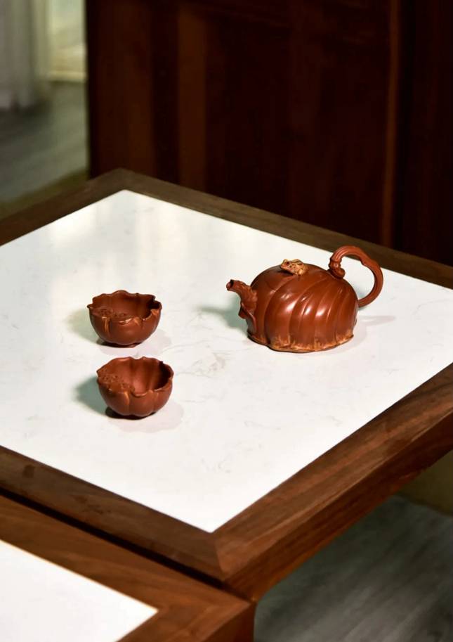 此拍品由一壶、两杯组成。荷叶包裹状作流,蓄势有力;荷梗蔓延曲折成把,枝梗上的肌理,刻画得精细入微;一只青蛙停留在荷叶之上为钮,栩栩如生;壶底作荷叶边缘线条状,显婀娜之美,并用异色泥料粉饰,丰富了整器的灵动感;两杯以内敛荷叶为型,口沿一处塑若干莲子,富有情趣。此茶具套组展示了另一番荷塘风貌的景象,惟妙惟肖、意趣盎然;同时也凸显出作者所创作品融合了艺术美感与自然生趣,形成了独特的艺术风格。