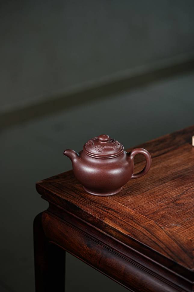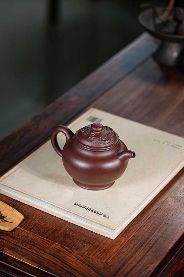 【匠心】此壶既承古法,又蕴新意。龙纹装饰刻画精细而不失大气,与壶体曲线和谐共生,兼顾视觉美感与执握舒适。375cc容量实用得体,聚香蕴味,彰显紫砂器“融艺于用”的哲学。