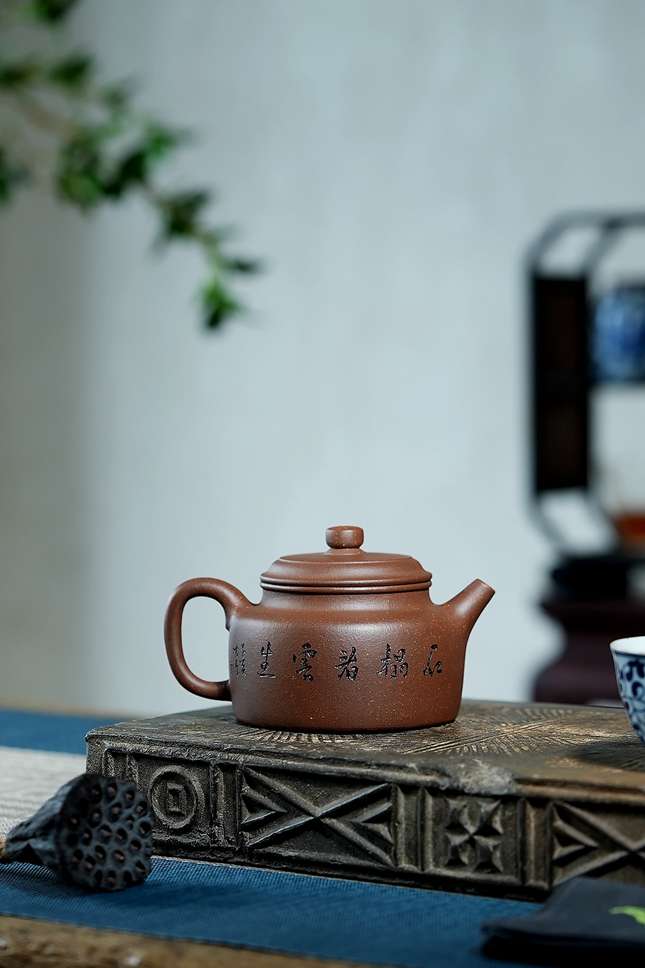 此壶形制简而精妙:圆柱壶体匀挺端庄,折肩蓄力,长颈舒展,拱盖与口沿以严密的子母线相合,线面流转自如,处处透出制壶者对传统法度的恪守与升华。壶身铭刻文字笔意隽永,刀工洗练,为朴素的壶体注入文心雅韵,平添几分书卷气息。