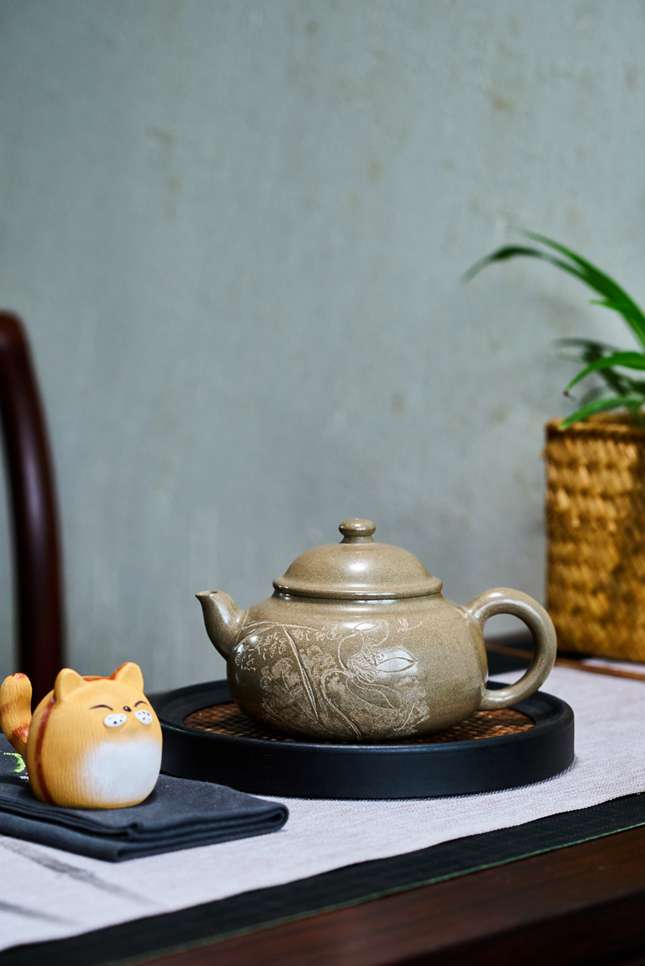 《莲意》紫砂壶由王老师与何老师联袂创作,采用家藏青段泥料与水磨工艺,呈现珠宝般光泽。壶体造型端庄简练,刻绘佛手拾莲图案,传递心无挂碍、自在从容的禅意哲思,融器型、工艺与人文内涵于一体。