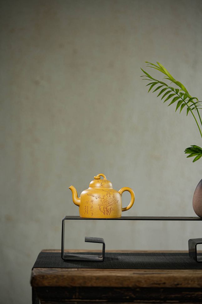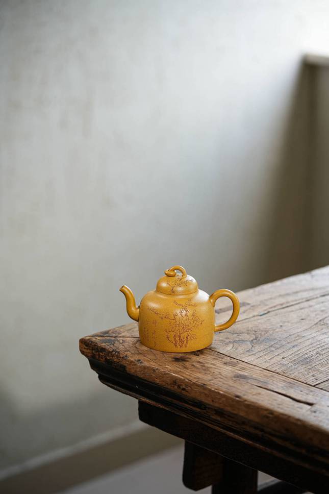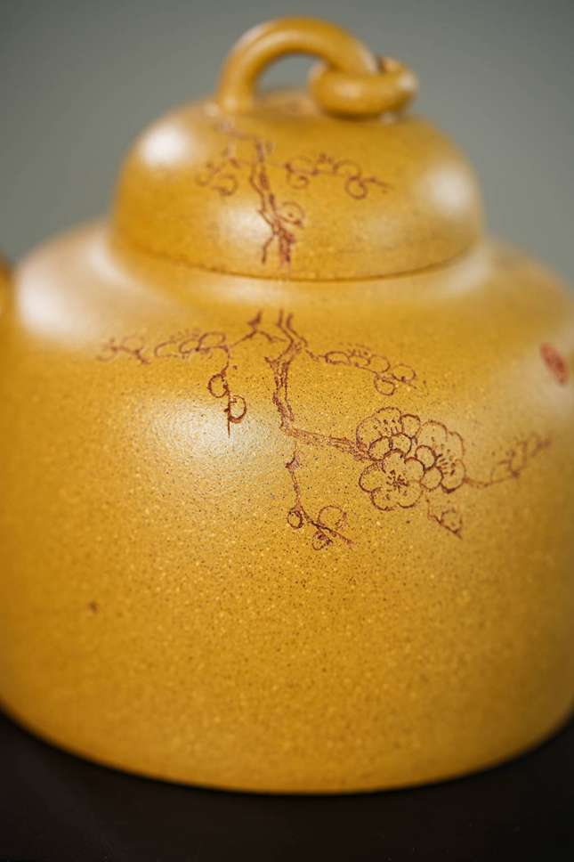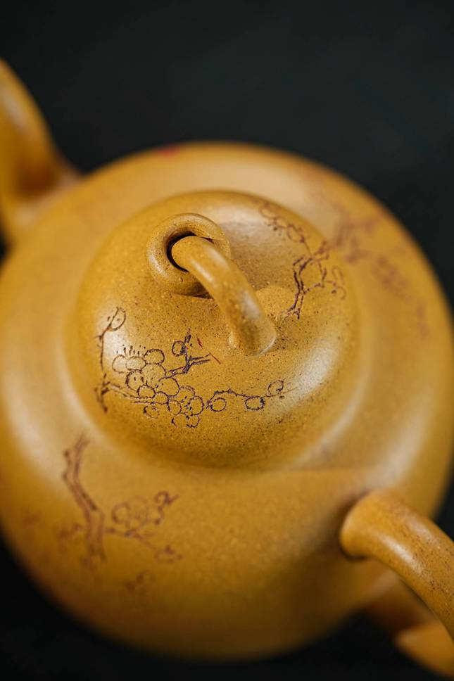 整器集造型、泥料、雕刻与人文意蕴于一体,既有挺拔大气的筋骨,又不失文人雅物的细腻情致。观之可感梅香透壶、金泥生暖,是实用与赏鉴皆宜的紫砂佳作,亦在方寸之间寄托了东方美学中自然与器物相融的深远意境。