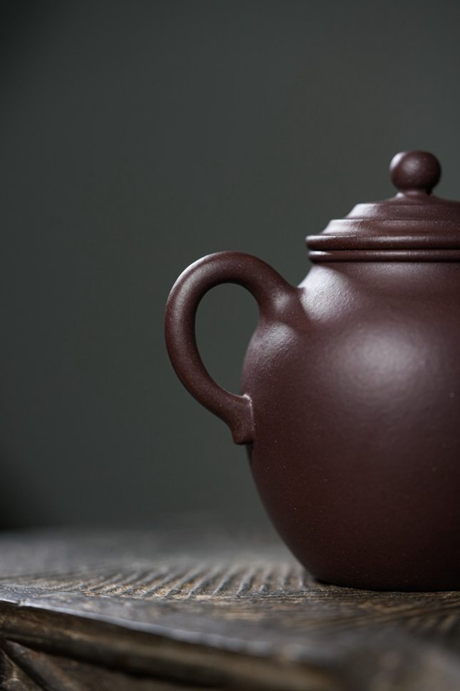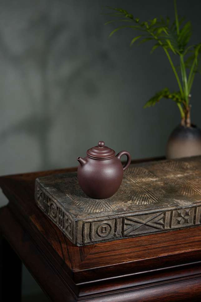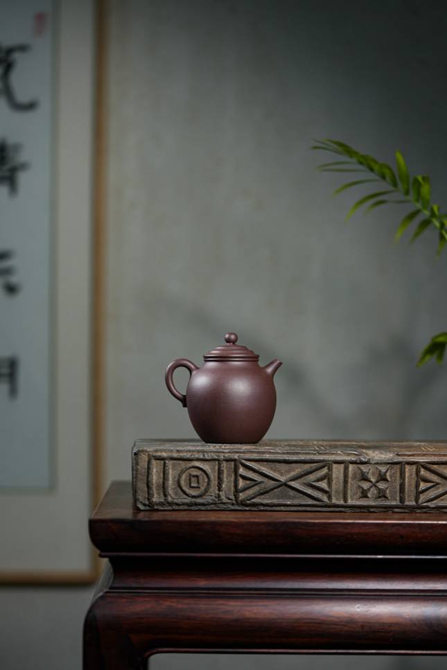 谈健超手制《大彬橄榄壶》,以原矿紫泥塑橄榄圆融之形,承袭明代时大彬简朴风骨。壶身线条流畅,盖、流、把精巧实用,气密性佳,出水爽利。作品融古雅与实用于一体,是茶席臻品,养护日久更显温润包浆。