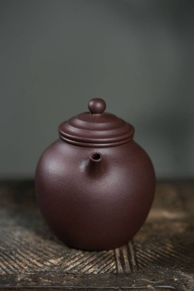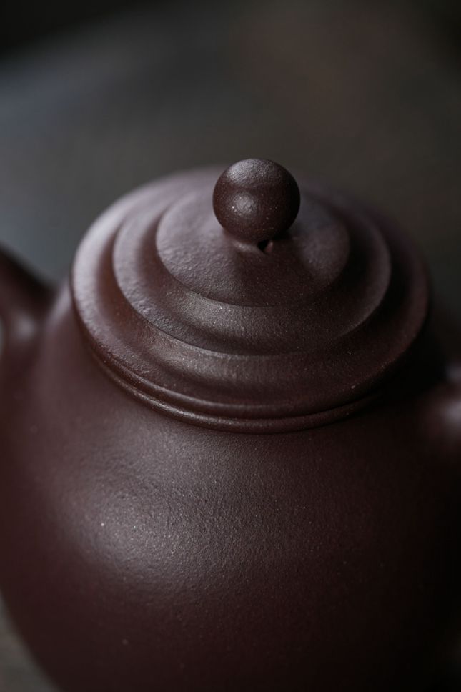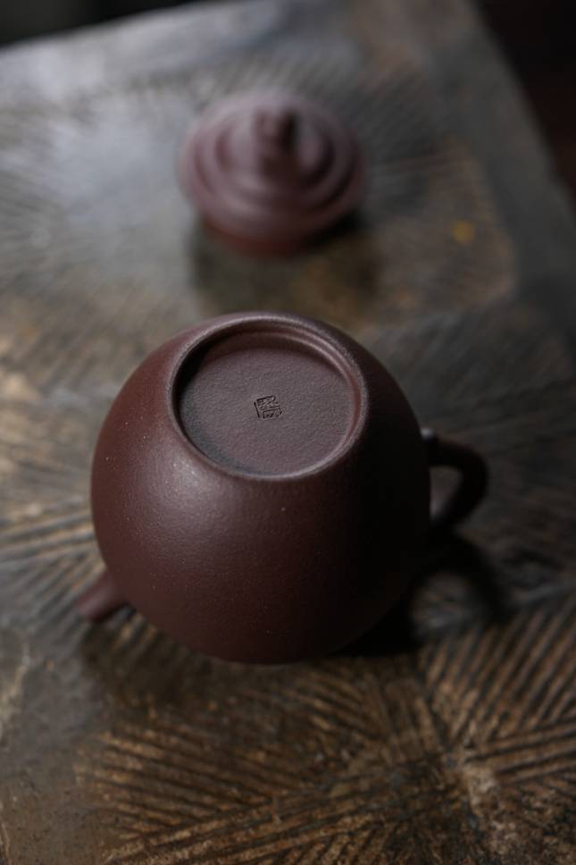 整壶以精选原矿紫泥抟制,泥色沉静如夜,砂粒隐现其间,肌理温润中透着朴拙力道。壶身线条是作品灵魂所在,自丰肩处向下缓缓内收,至底足又略作舒扬,一如橄榄自然形态,流畅婉转中蕴藏着劲挺骨相。壶盖设计尤见匠心,数道弦纹层层漾开,与壶体弧线呼应共鸣;圆珠钮则如画龙点睛,便于提拿之余,更添和谐韵律。盖与口密合无隙,保证了绝佳气密性,是为实用根基。