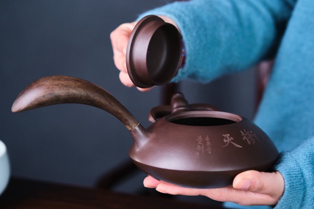 整壶既承袭唐风古韵,又融现代审美巧思,执于手中仿佛可聆听历史回响。细长壶柄不仅赋予独特视觉美感,更贴合掌心弧度,宜赏宜用,让每一次品茗都成为与时空对话的雅事。
