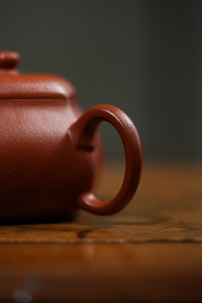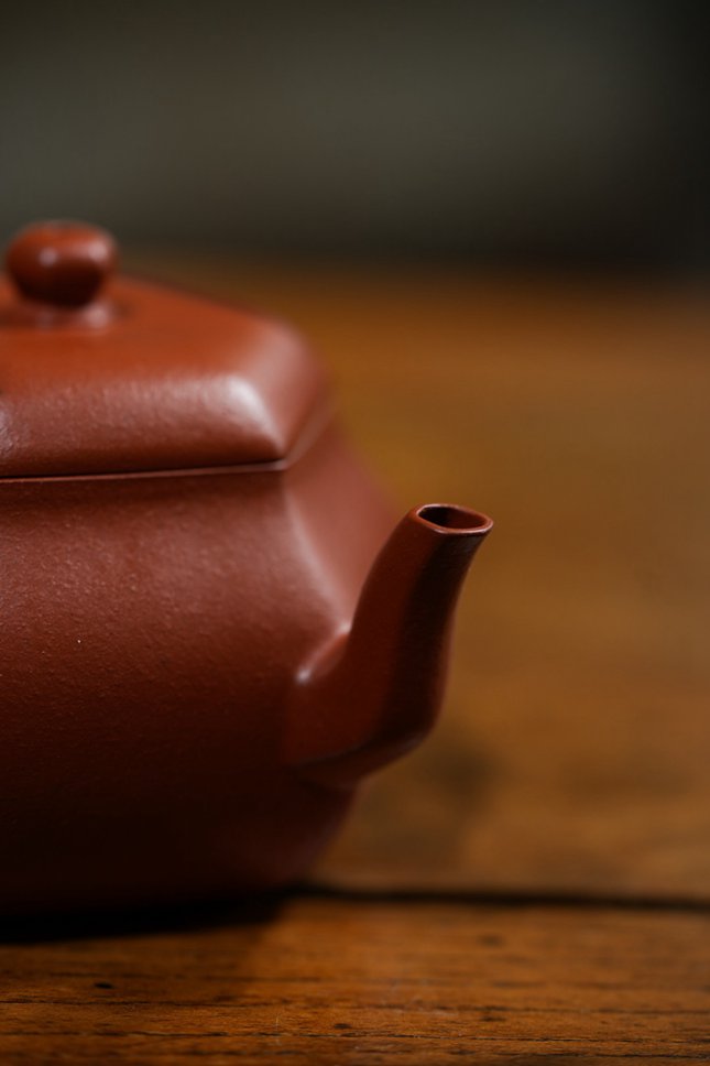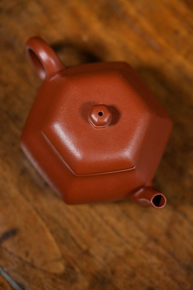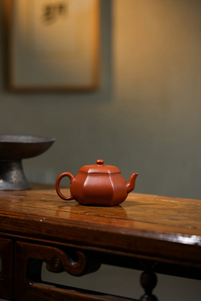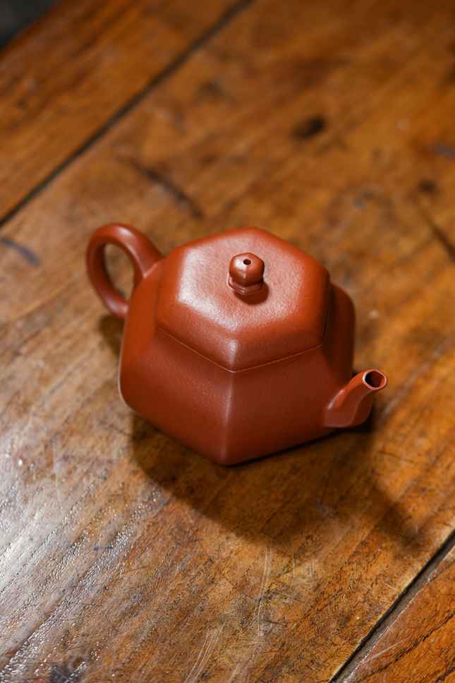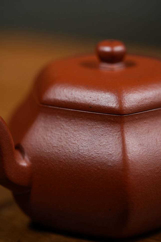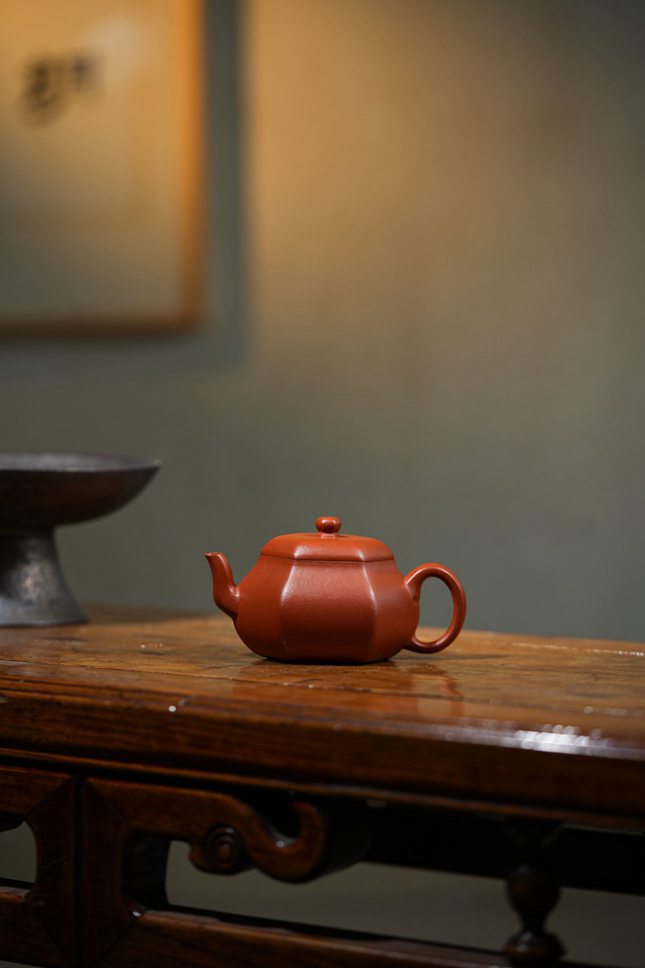 平底六方底座,沉稳端庄,确保壶体安若磐石。在光影流转间,壶身棱线折射出朱泥温润细腻的肌理与光泽,于无声处彰显极致匠心与高端质感。