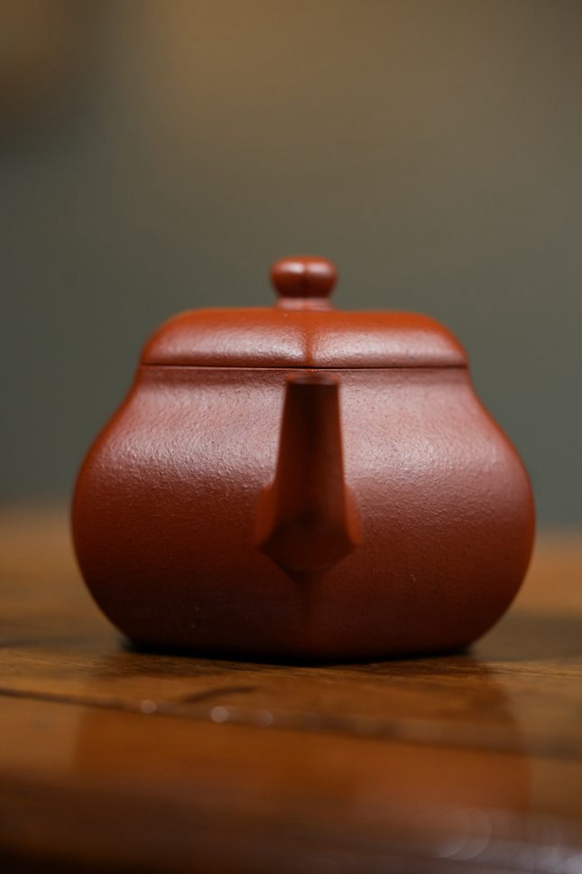 王涛,作为实力派名家马璟辉先生的高徒,深得方器制作精髓。他手制的这把“六方宫灯”朱泥壶,以140cc的雅量,将梨形的柔婉与六方的挺括完美相融,在方圆之道中尽显东方雅韵。壶身线条利落,收敛弧线温润得体,六瓣菱花轮廓层次分明,于规整几何中透出文人清雅,不张扬而自有贵气,是一件适配高端茶席、值得案头珍藏的传世之作。