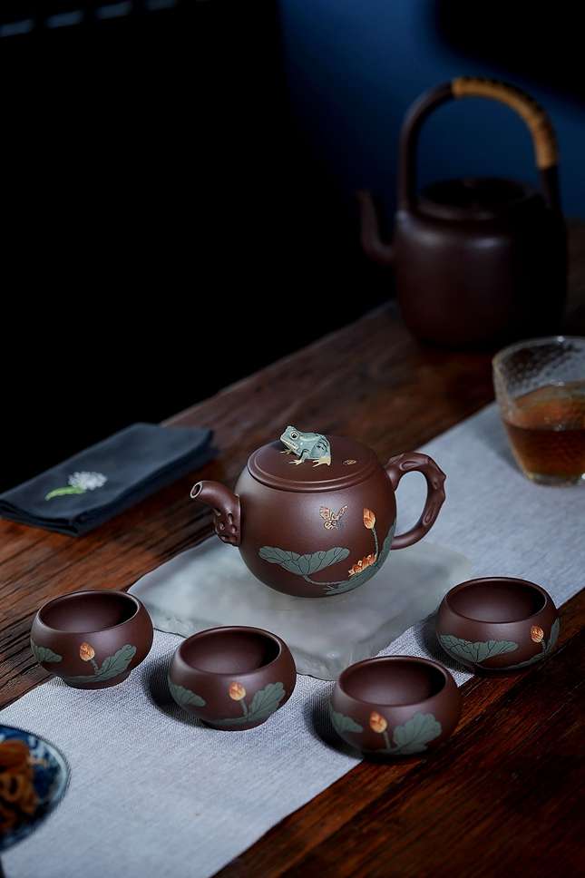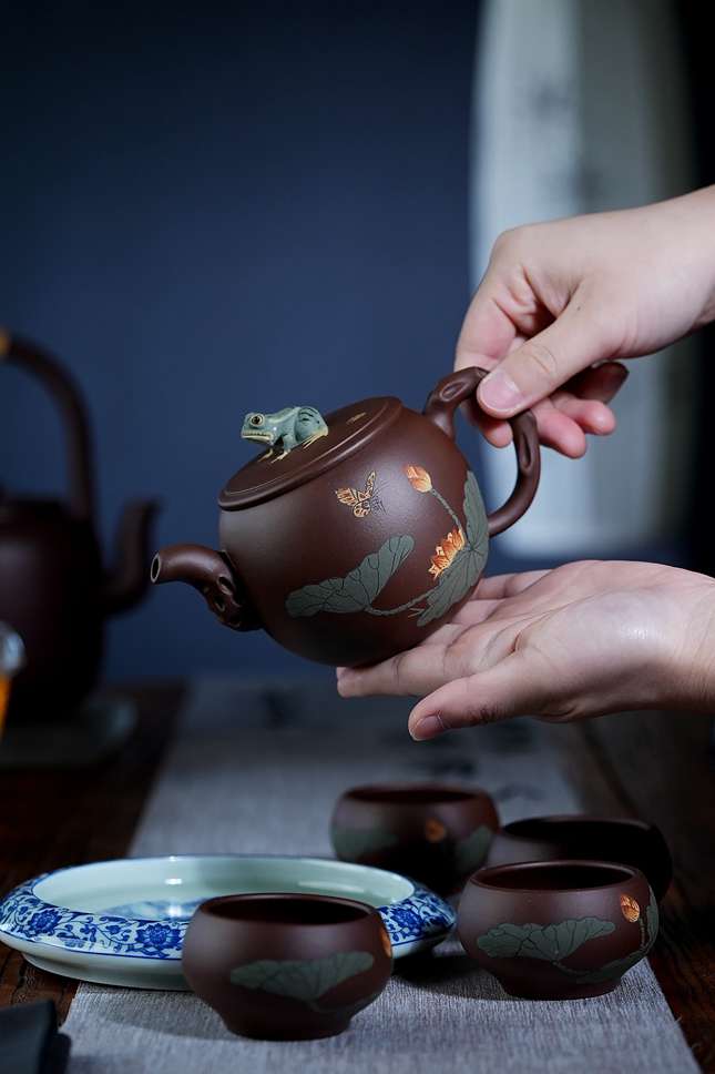 壶身装饰乃点睛之笔:以彩泥绘饰荷塘清景,莲叶田田,荷花亭亭,色彩清雅明快,观之如沐夏风,心生清凉。壶钮更巧思独运,塑一只跃然欲动的青蛙,蹲踞盖顶,细节刻画栩栩如生,神态憨拙灵动,顿为整器注入盎然生趣。