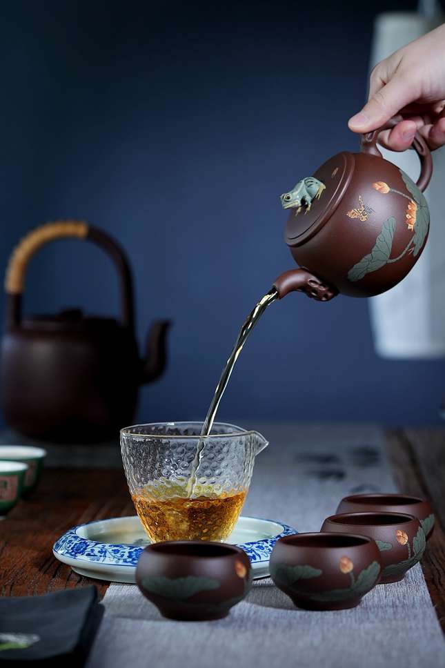 整壶以“莲”立意,借紫砂温润之质,融自然生机于器用。莲之高洁、蛙之野趣,在方圆格局中相映成趣,恰合“荷塘清趣”之境。不仅可见作者深厚的塑形功力与文人雅意,亦在品茗之余,寄寓一份怡然自得的田园诗情。