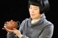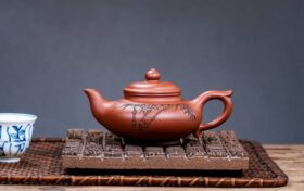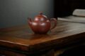 此壶精选家藏老紫泥,容量330cc,为研高职称陈老师匠心手制。壶型以圆为体,线条浑朴有力,整体端方稳重,比例协调匀停,于沉稳中透出丰腴雅致之气韵。壶流与壶把分别塑作莲藕、卷叶形态,生动宛转,与压盖设计呼应一体,兼顾视觉美感与实用之便——网孔十孔,出水爽利,执握舒适。