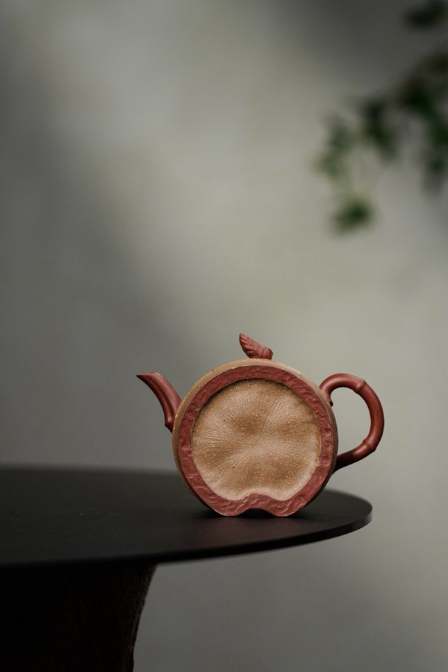 《韵竹》壶由国家级高级工艺美术师周老师以紫泥粉段泥制成,取竹段为型,生动雅致。壶身竹叶贴塑灵动,线条流畅挺拔,兼具力量与优雅。器型古朴光润,意趣盎然,集观赏、实用与收藏价值于一身。