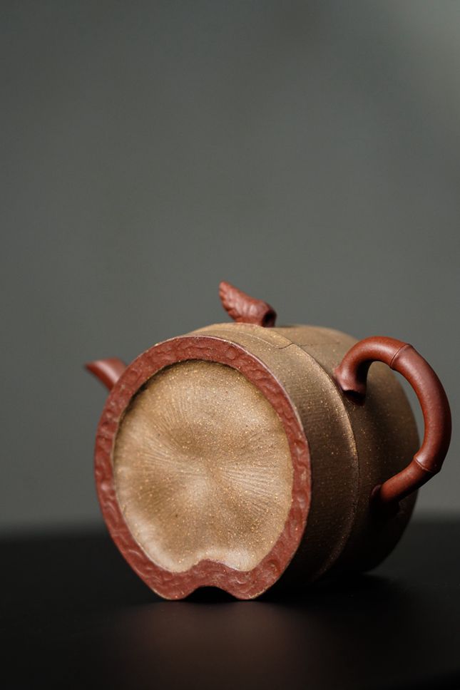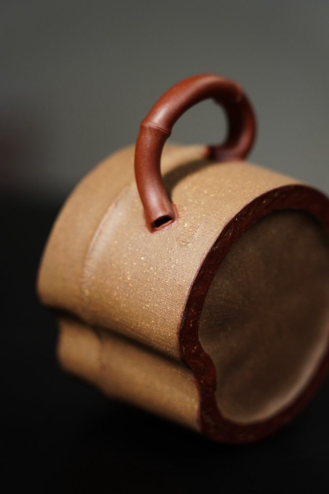 此壶以竹段为型,造型逼真而富有生机。壶身、流、把、钮皆取竹节意象,线条流畅挺拔,做工严谨精细。舒展的竹叶贴塑于壶身,生动传神,于力量感中透出温柔优雅。