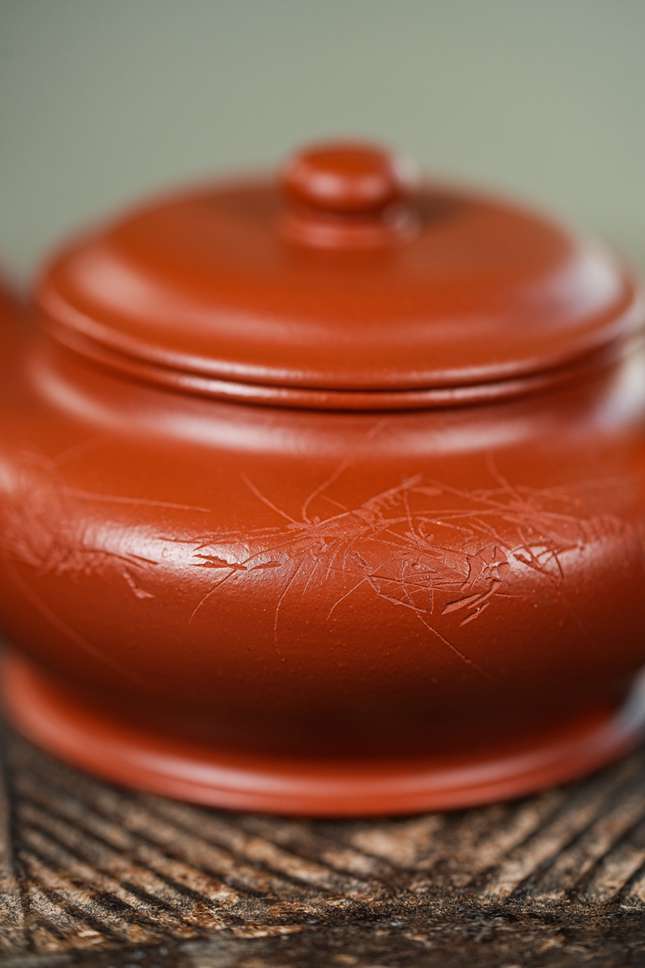 细观其工艺细节,盖、钮、足处处匀挺,衔接浑然。圈足托举全器,使整壶更显挺拔庄重,不媚不俗。朱泥胎体在窑火中淬炼出的微皱肌理,宛如清波澹澹,光华内敛。