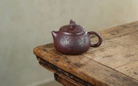 【虚扁】以珍稀小煤窑朱泥为胎,泥色温润嫣红,胎质致密油亮,容量精巧定为150cc,恰合三五知己品茗清谈。此壶由国家级高级工艺美术师尹老师全手精制,工艺与意蕴皆显匠心独运。