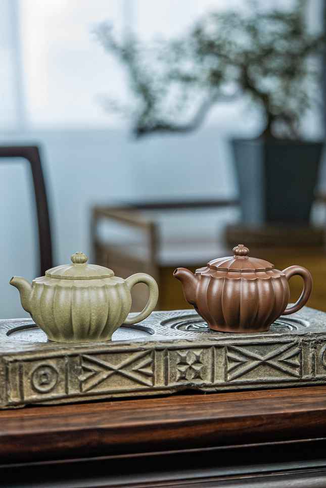此壶的妙处在于虚实相生的处理。凹面与凸起的筋纹错落有致,在光影流转间形成丰富的层次感。220cc的紫泥款与200cc的青段款各具风韵,紫泥沉稳醇厚,如秋日午后的暖阳;青段清秀雅致,似清晨微凉的秋风。两种泥料演绎着同一主题的不同意境,任君选择。