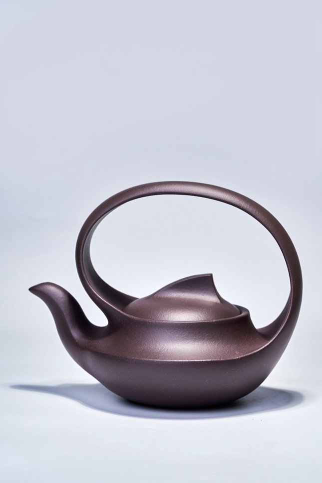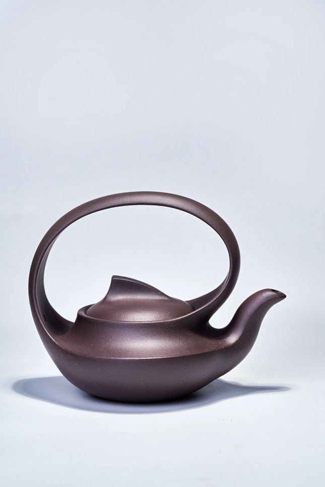 这把【曲壶】以原矿天青泥精制而成,泥色温润古雅,容量达420cc,为资深藏家所重。其器型灵感源自自然界的蜗牛,壶身线条回旋有致,充满了流动的韵律美感。壶嘴巧妙地从壶的腰线中起伏延伸而出,不仅轮廓清晰,更在静态中展现出蓬勃的活力,是“曲壶”这一经典器型中形神兼备的佳作。