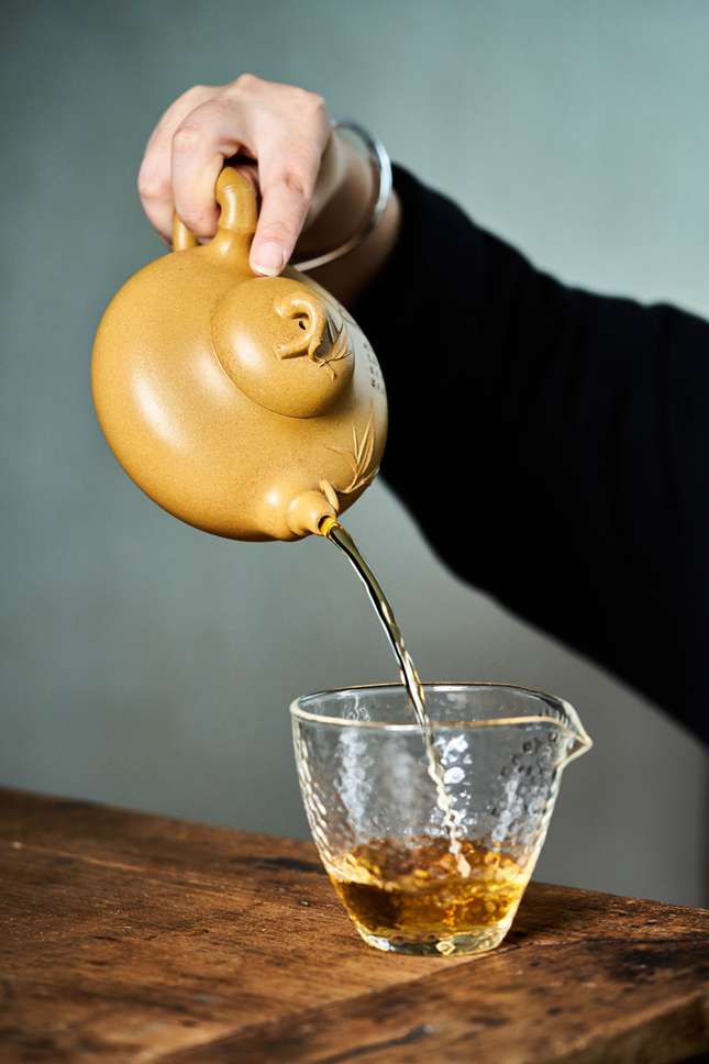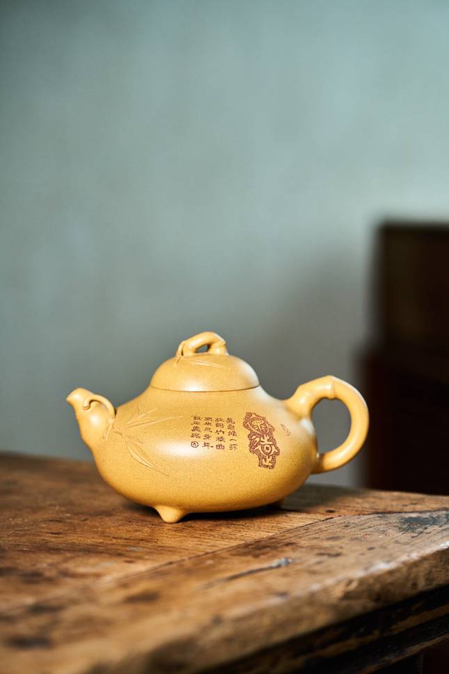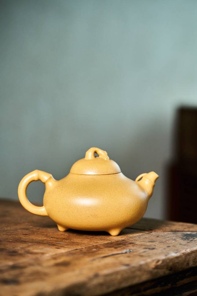 这把由国家级高级工艺美术师陈老师手制的【三足竹鼎】,选用珍稀的原矿黄金段泥精工抟制,泥质温润,色泽如金,容量达380cc,尽显沉稳厚重之气。此壶以竹为创作灵魂,巧妙截取竹之劲节幻化为鼎身,线条柔韧而富有张力,气韵挺拔高雅。壶底三足秀美内敛,不仅均衡了视觉,更平添几分青铜礼器般的古朴与庄重。