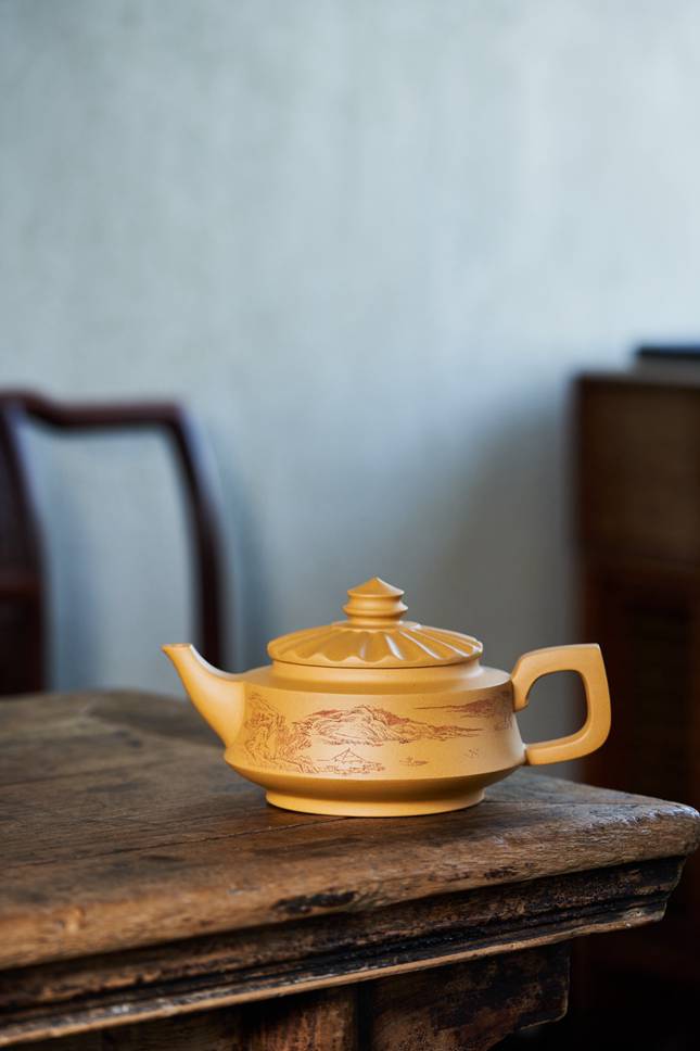 壶身精刻的山水画卷是此壶的点睛之笔。老师以刀代笔,将远山、白云、流水刻画得气韵生动,意境深远。画面看似疏朗平淡,实则将隐者若即若离的超脱感表现得淋漓尽致,使作者自身高古脱俗、闲适高雅的品格气质,悄然跃于这韵致清远的画境深处。观之品之,仿佛能感受到江南烟雨中的那份静谧与悠然。