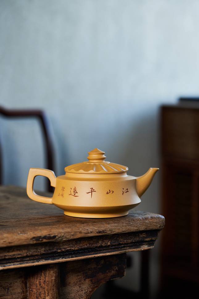 这把【烟雨江南】壶,是研究员级高级工艺美术师陈老师的倾心之作。陈老师师从紫砂名家顾道荣与何道洪,技艺传承有序,此壶以优质段泥为胎,容量达690cc,形体挺拔饱满,尽显大家风范。壶盖微微隆起,并饰以筋纹阳线,线条流畅利落,犹如古代亭台的飞檐翘角,亭亭玉立,与壶口、壶身的线条衔接得天衣无缝,展现出一种结构上的典雅韵律。