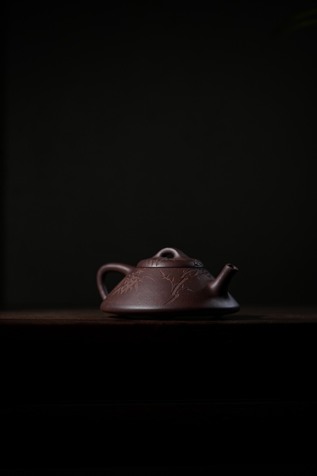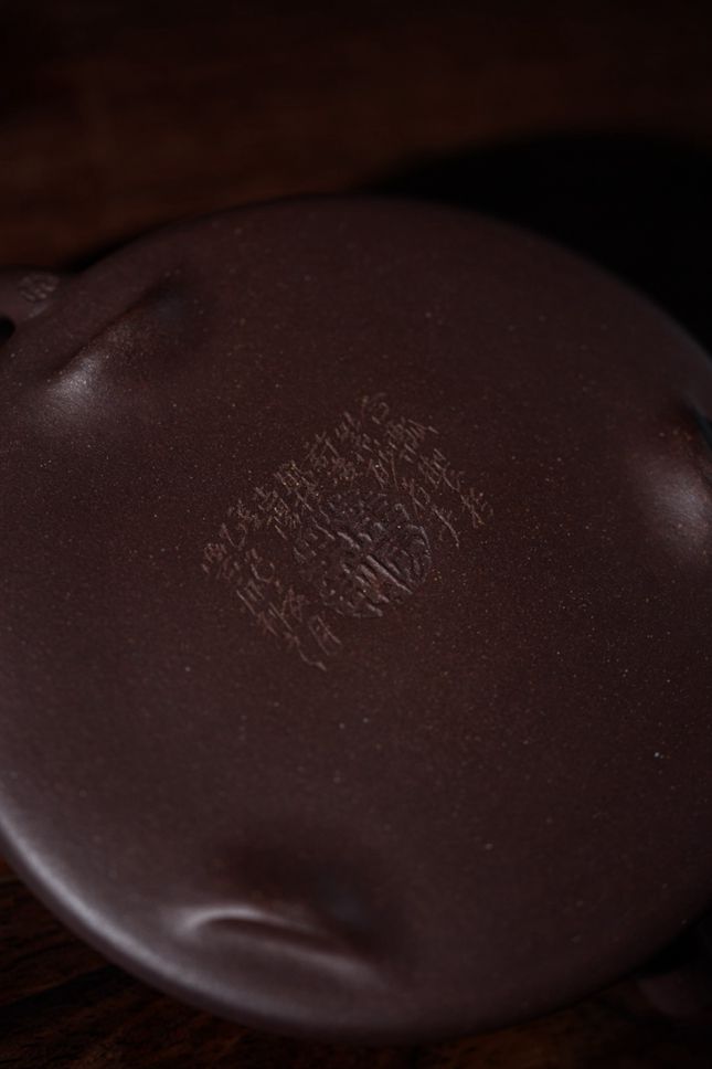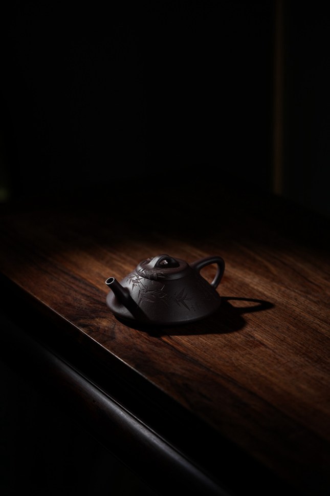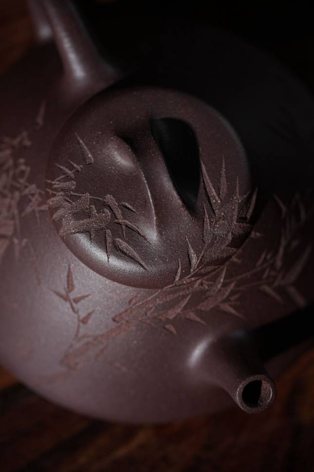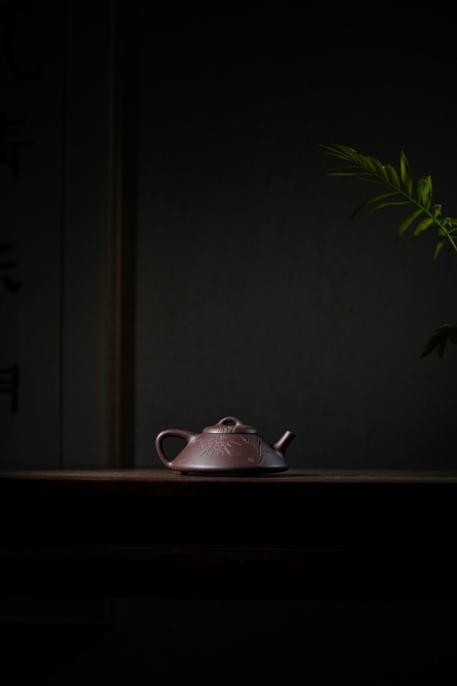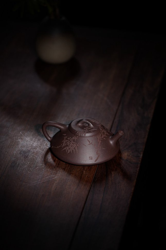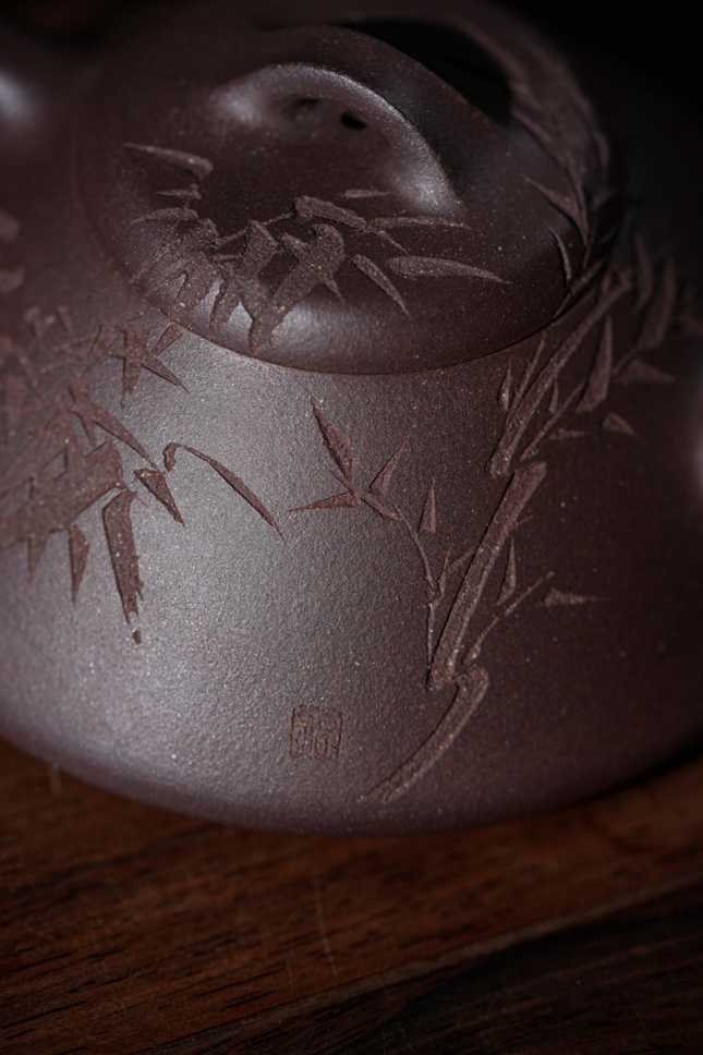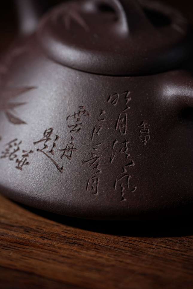 它不独为瀹茶而作,更是一方掌中可赏的天地。从壶底印章到盖内款识,每一处细节皆可推敲,刻绘线条深浅有致,既保留了材质的质朴,又彰显了工艺的精湛。待沸水冲瀹,茶香氤氲之间,壶身的竹影与墨韵仿佛被茶汤唤醒,徐徐舒展。持壶品茗,方寸之间,竟能窥见天地之宽,品得文人之雅。