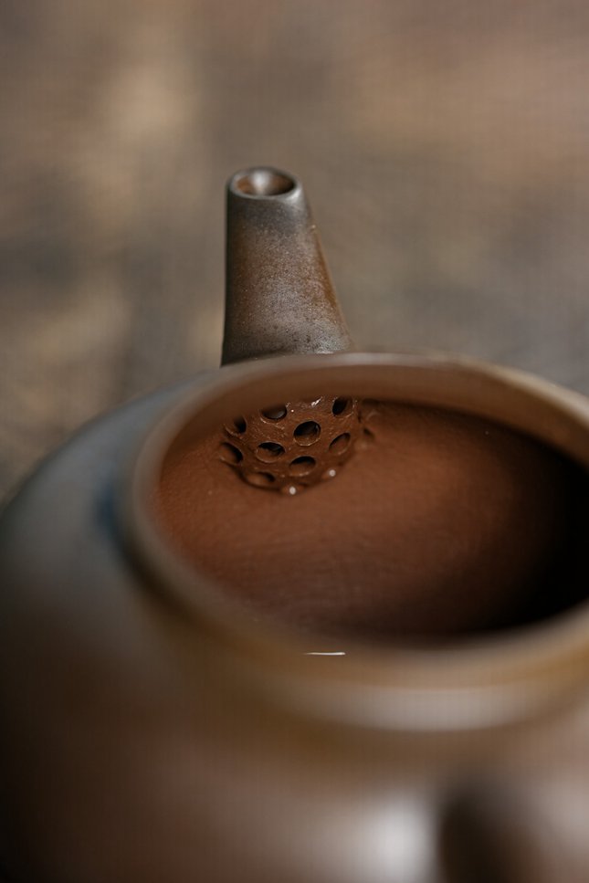 壶式取法经典笠帽造型,壶盖穹起如斗笠覆顶,线条简练而富有张力。壶身圆润饱满,自壶肩至壶底过渡流畅自然,壶流三弯胥出,若鹦鹉之喙,出水爽利断水自如;壶把环扣有力,握持间重心妥帖,尽显实用巧思。惠老师以纯手工技法抟制,在传统器型中注入个人的审美意趣,令整器于简素中见精雅,于古朴中透灵秀。
